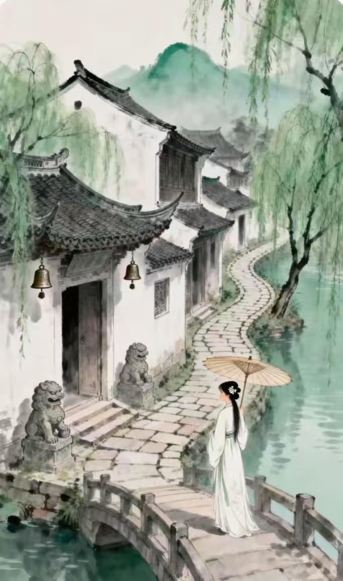 天净沙·闲游 石桥轻步荷伞, 柳丝垂水拂鞍。 深巷狮蹲石畔。 长阶空院, 黄鹂声