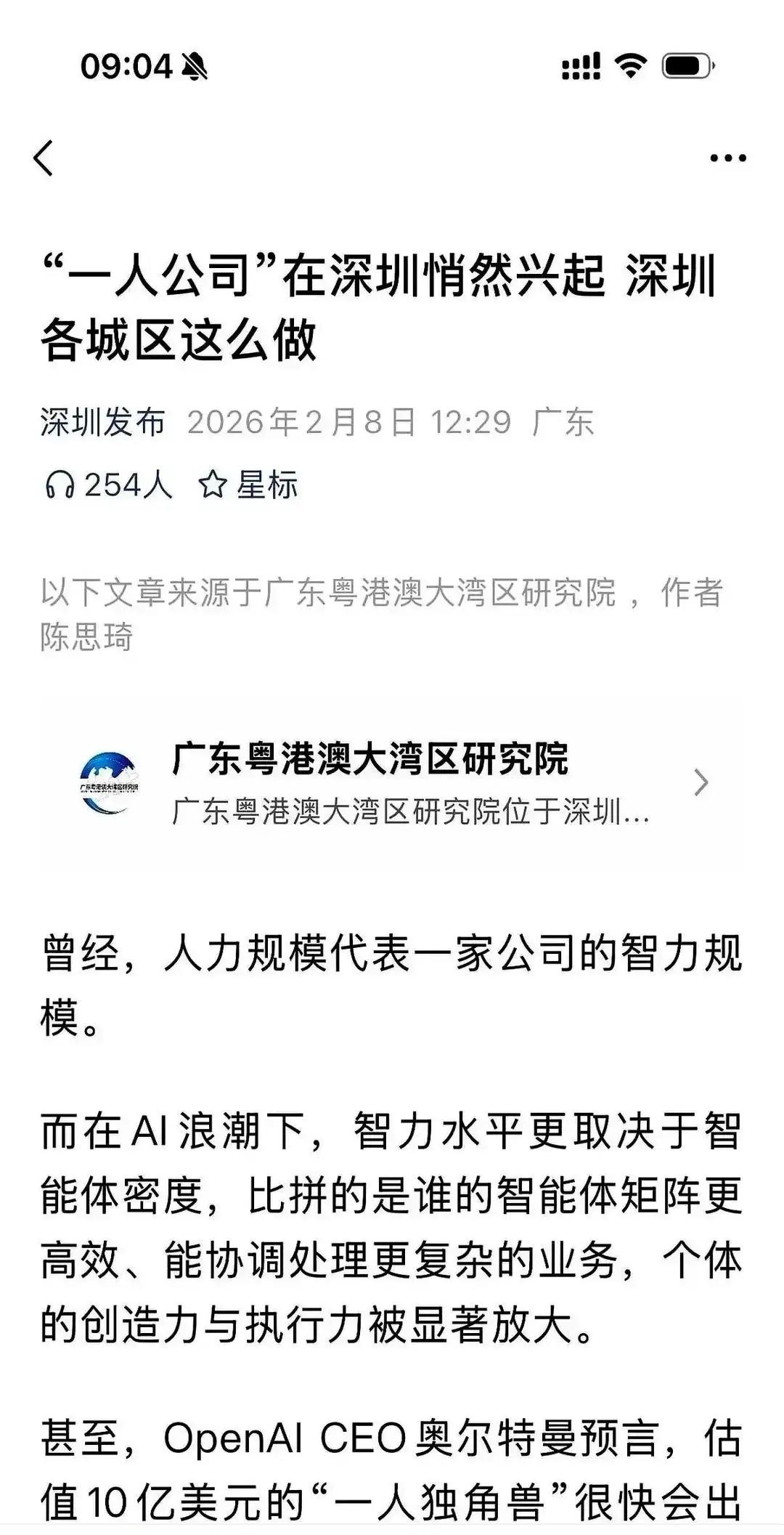 深圳的嗅觉就是灵敏啊 开始鼓励一人公司了 其实ai时代 一人公司确实非常有优势。当然一人公司不是一个人的公司,是只有一个核心人物。 一人公司的发展需要两个硬条件。 1、年轻人不被房贷绑住,如果被房贷绑住那么一辈子就不要想自己做事了,打工还完房贷退休就好了。 2、大公司不阻拦,大公司都有政府游说团队,哪天一人多到公司威胁到大公司,权力就会限制,当然现在其实也不方便,注册容易注销难,当然大部分小公司最好的结局是被收购。 ai时代不同于电商时代,开个网店开个直播就行。 ai想要商业运行,没有公司不行。
