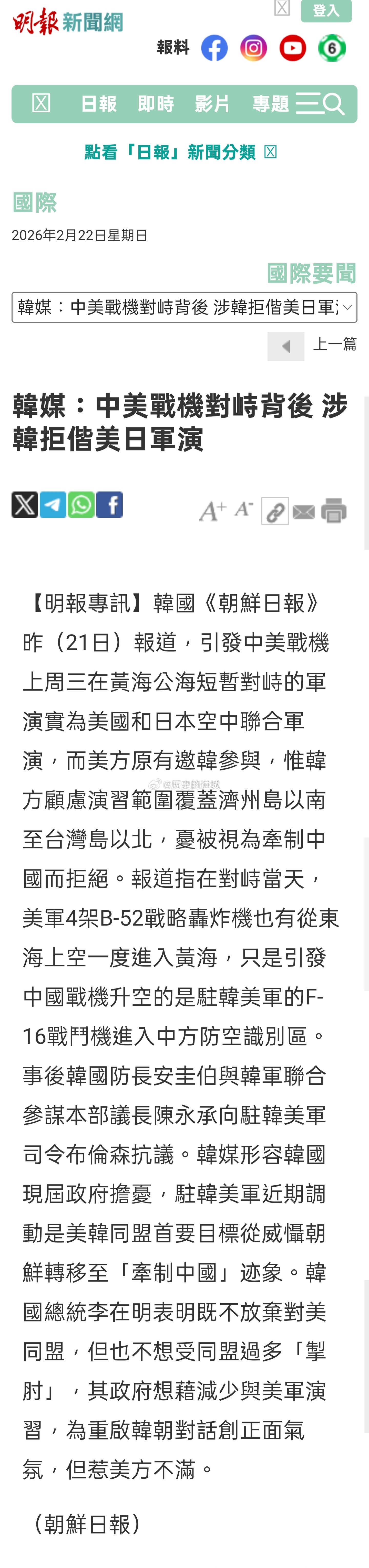 韩国《朝鲜日报》21日报道,引发中美战机上周三在黄海公海短暂对峙的军演实为美国和日本空中联合军演,而美方原有邀韩参与,韩方顾虑演习范围覆盖济州岛以南至台湾岛以北,忧被视为牵制中国而拒绝。