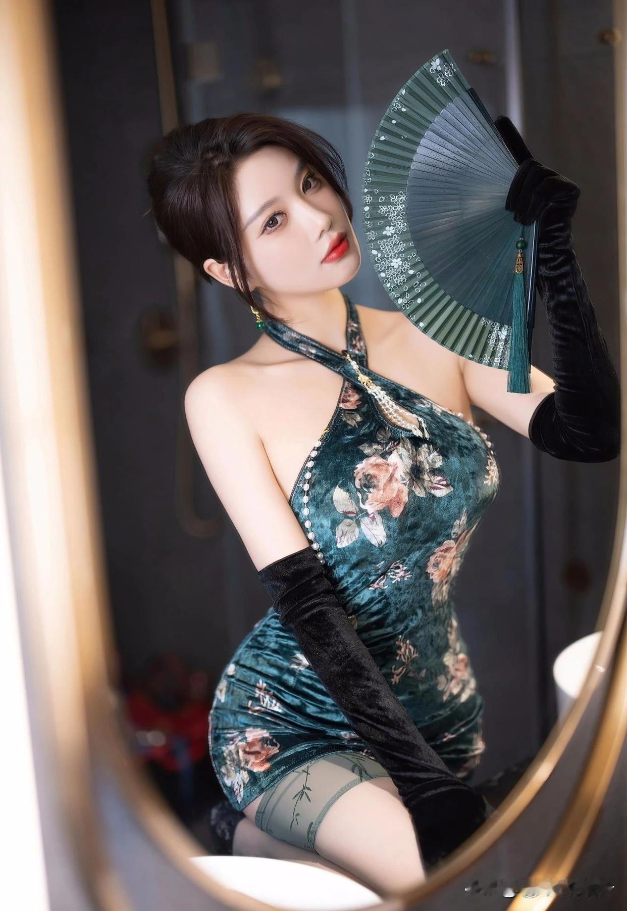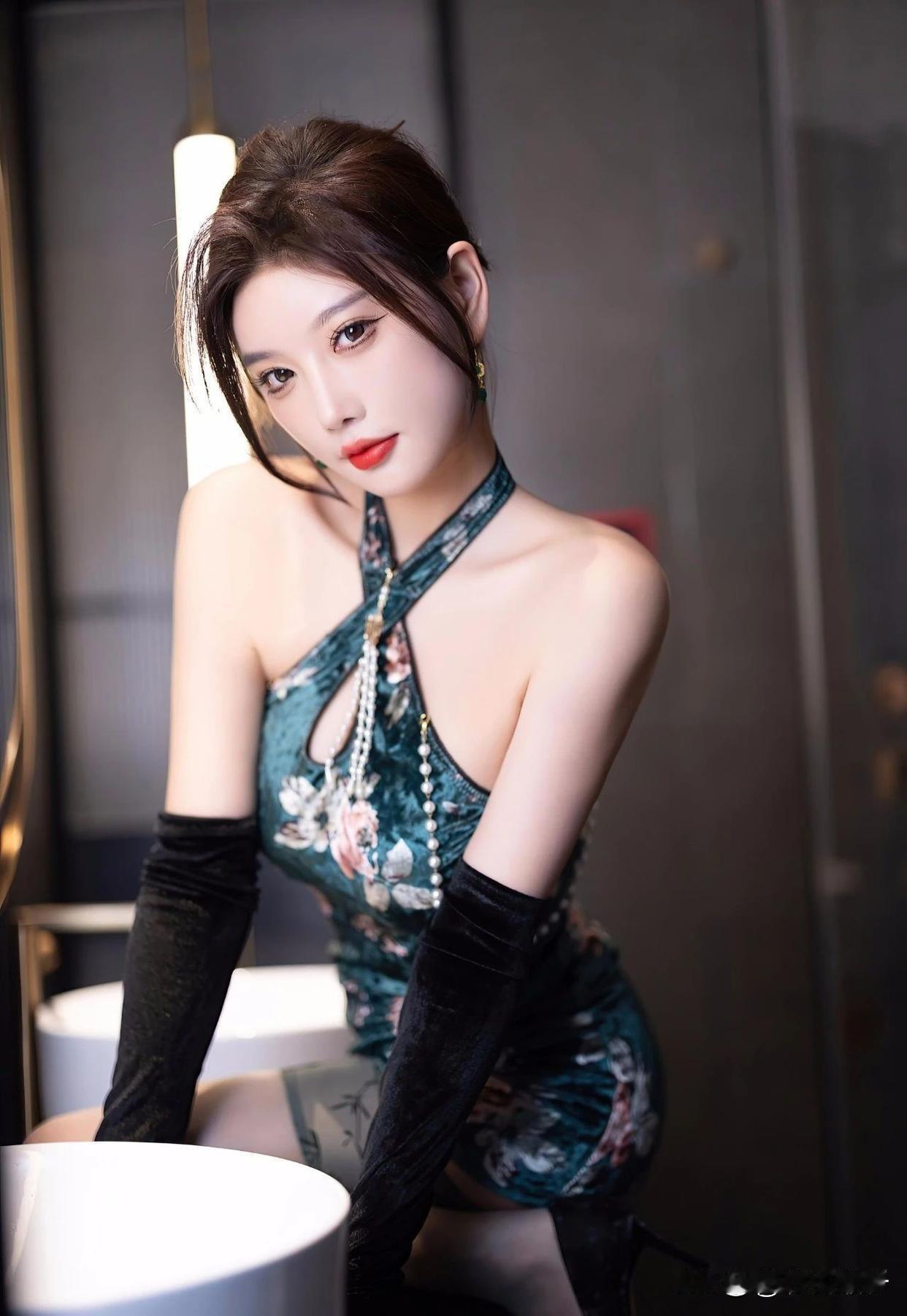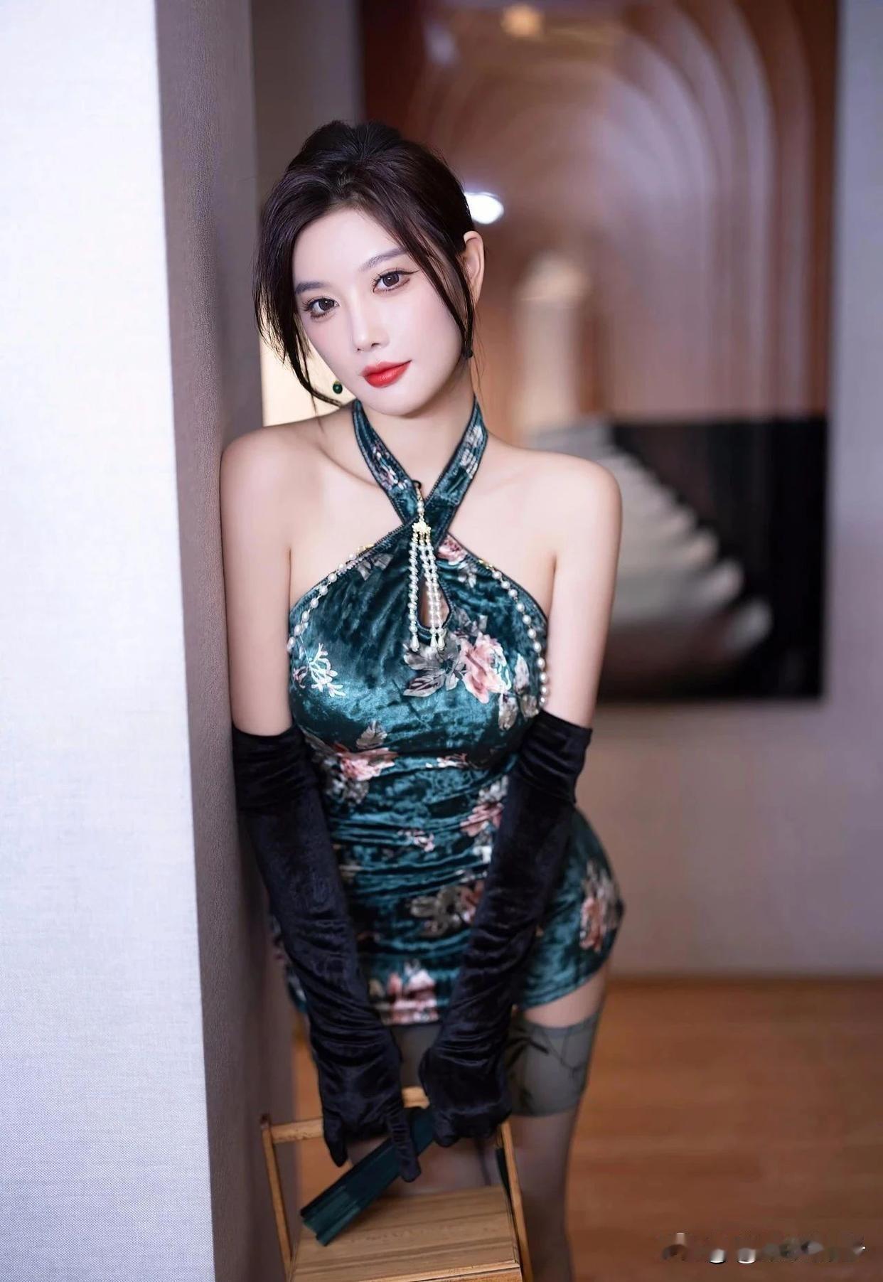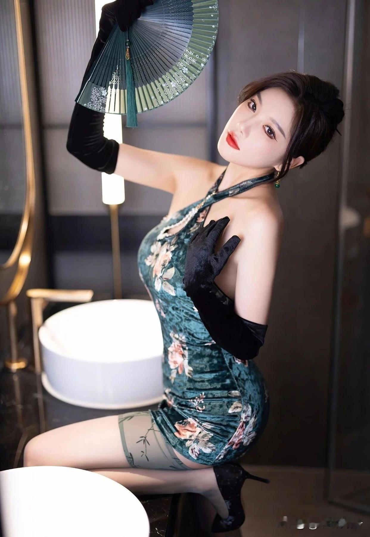 "优雅坐姿,轻拢慢捻,古典韵味在指尖流转。"长腿女神唐安琪 旗袍小妈 甜风旗袍图