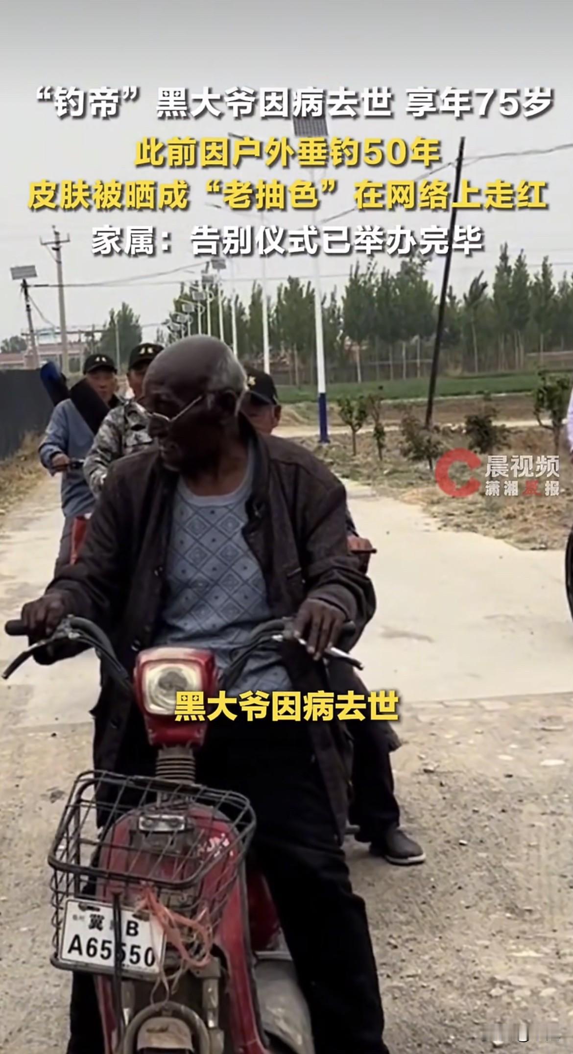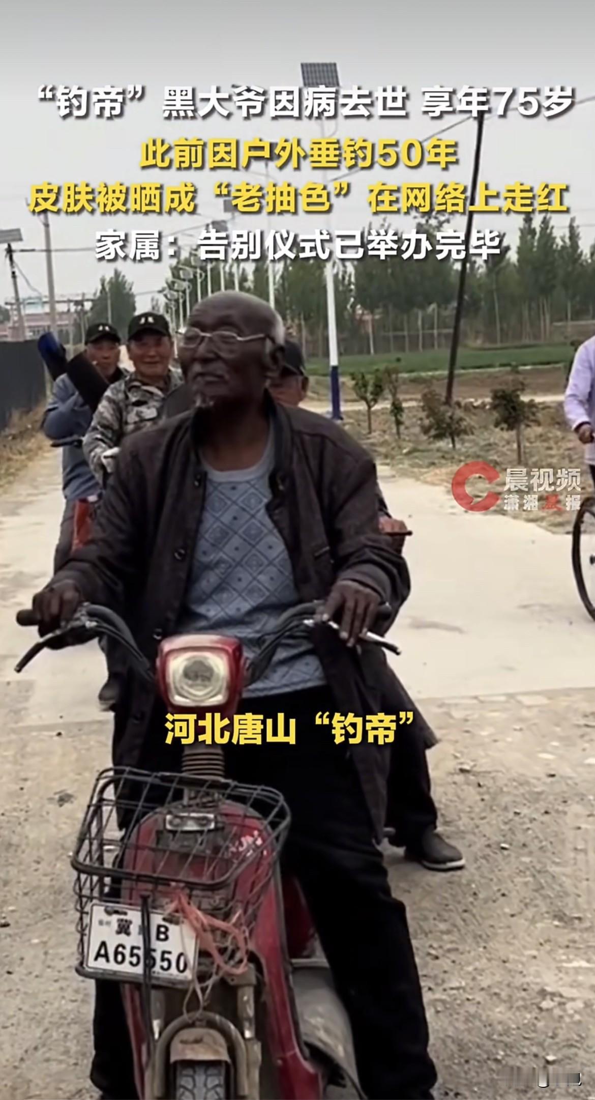 家人们谁懂啊?那位浑身黑得发亮、像老抽成精的“钓帝”大爷,真的走了。 河北唐山的安国勇大爷,因皮肤黝黑被网友称为“八级钓帝”。2月21日,家属证实老人因病去世,告别仪式已经办完,享年75岁。 很多人认识他,是因为那段骑电动车去钓鱼的视频。视频里他皮肤黑得发亮,网友调侃是“巧克力大爷”。这身肤色是几十年钓出来的,一天不摸鱼竿就浑身难受。 安大爷钓鱼从十来岁开始,一钓就是六十多年。每天早上六点半,骑电动车去野湖,一坐就是大半天。下雨也去,冬天冰上凿个洞也钓。 儿子说他夜钓的时候往那儿一坐,黑得都看不清人。这话听着像玩笑,细想全是老人对钓鱼的痴迷。 走红后很多人去河边看他,有人质疑炒作。儿子反问:一个七旬老人炒作啥?对他来说,钓鱼就是生活本身。 安大爷用的是老年机,不懂什么是网红。每天最大的事就是去河边坐着,和老伙计们聊聊天,等鱼上钩。 以前每天能钓四五斤鱼,带回家自己吃。钓多钓少都乐呵,享受的是那个过程。用他自己的话说,比东家长西家短强多了。 除了钓鱼,他还种着15亩地,在镇上卖西瓜。皮肤黑不光是晒的,更是长年在地里刨食、在路边卖瓜留下的印记。 有网友拍过他家,土炕、老药瓶、剥落的墙皮。可角落里那只橘猫被喂得油光水滑,生活再难,他也把日子过得有滋有味。 老伴走了以后,钓鱼成了他最大的寄托。每天扛着鱼竿去河边,风里雨里都不落。他说只要能动弹就钓,就当养老了。 现在这位乐观豁达的老人,再也不能去河边了。 那一身被太阳晒出的“老抽色”,是他留给这个世界最深的印记。 你看过这位“钓帝”大爷的视频吗?对这样一位把爱好坚持了一辈子的老人,你想说点什么?