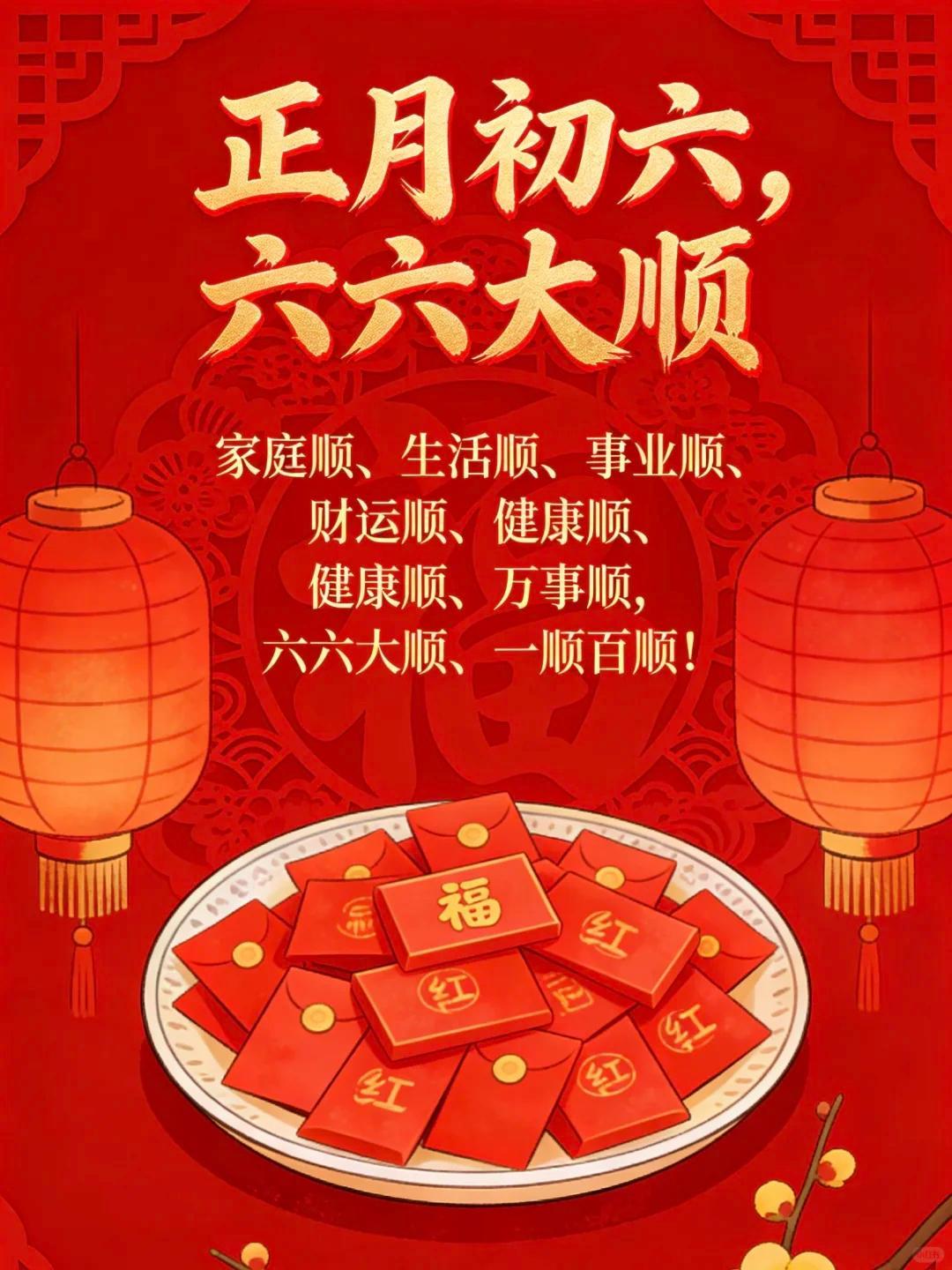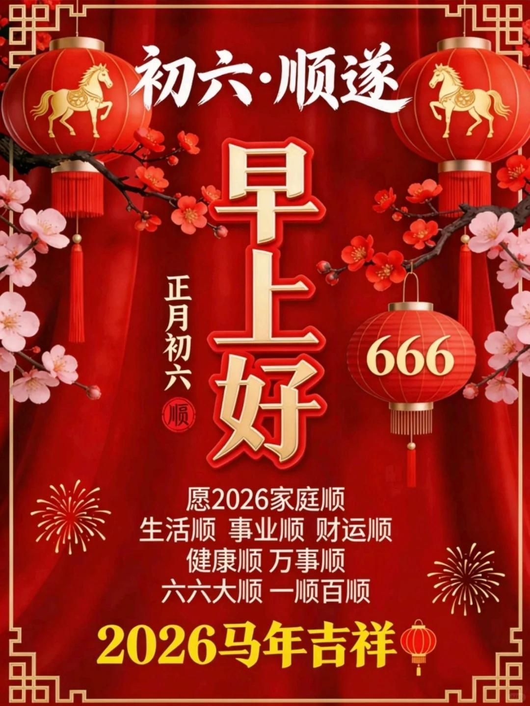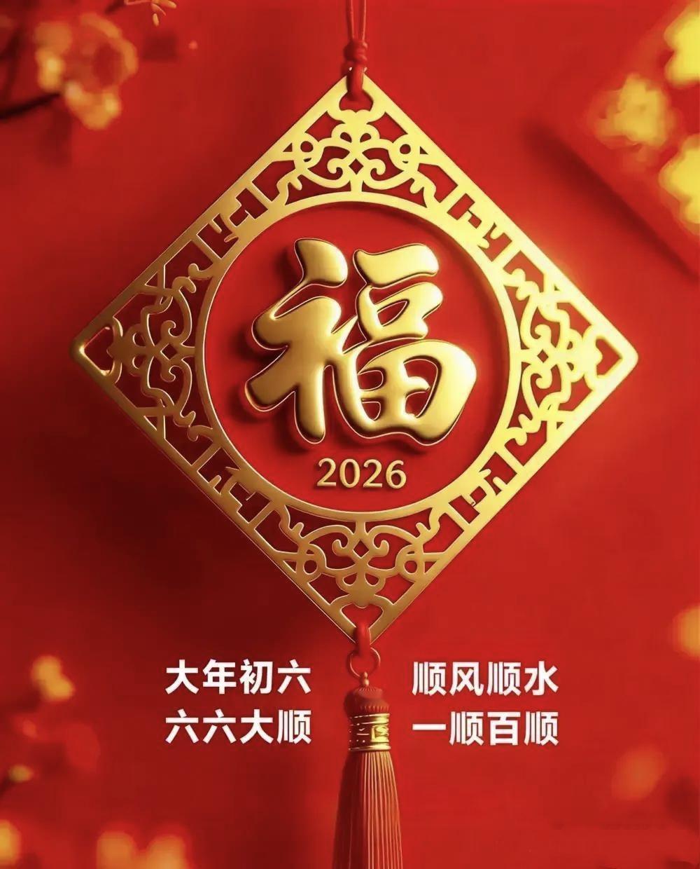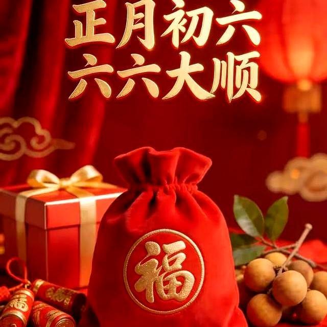 大年初六福满门,六顺临家万事兴。长寿富贵康宁聚,和善吉祥好运盈。早安如意,顺遂安康。传统文化 祝福 画画 书法