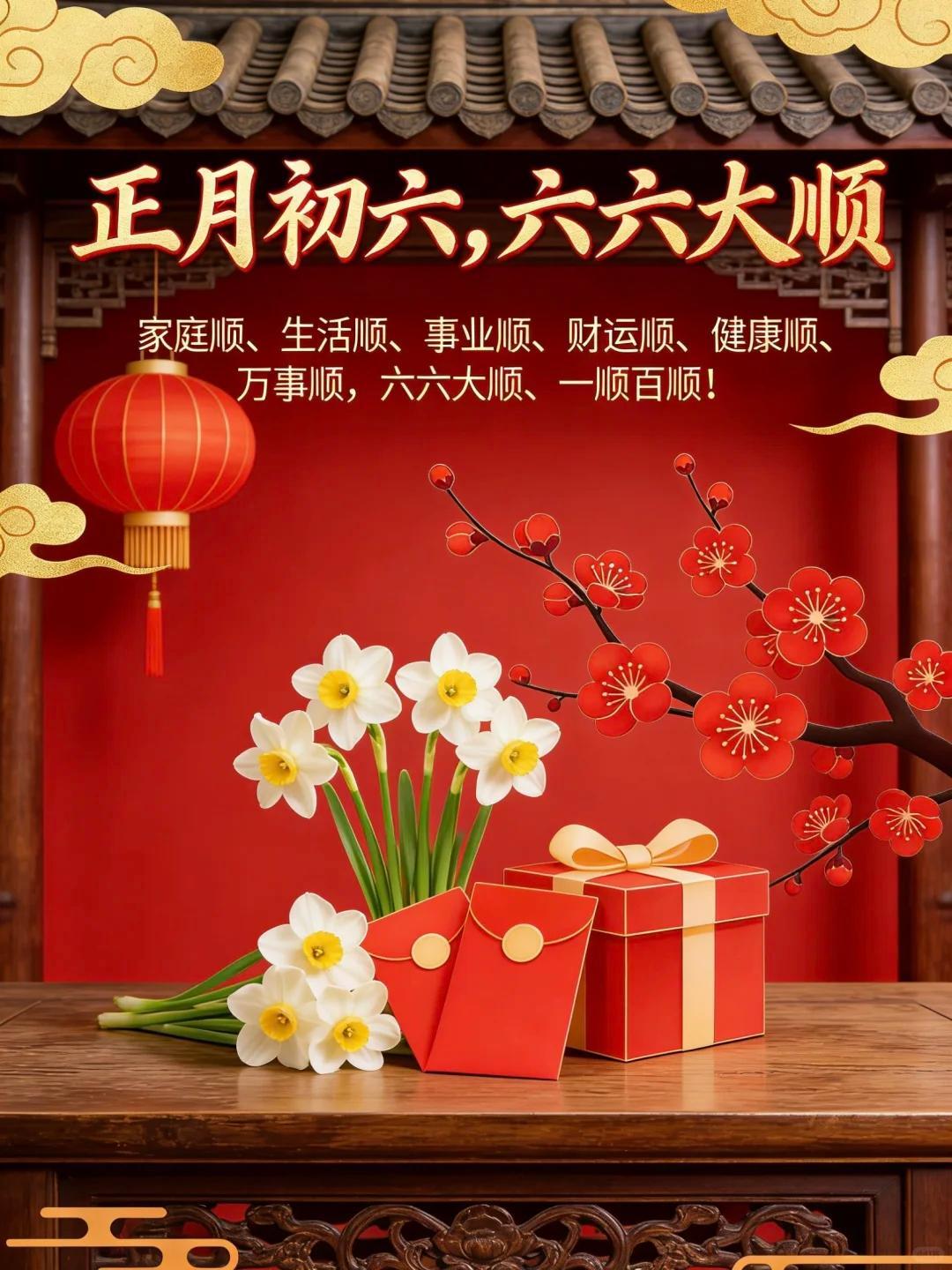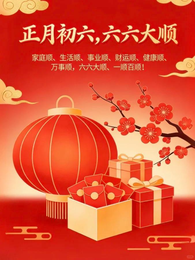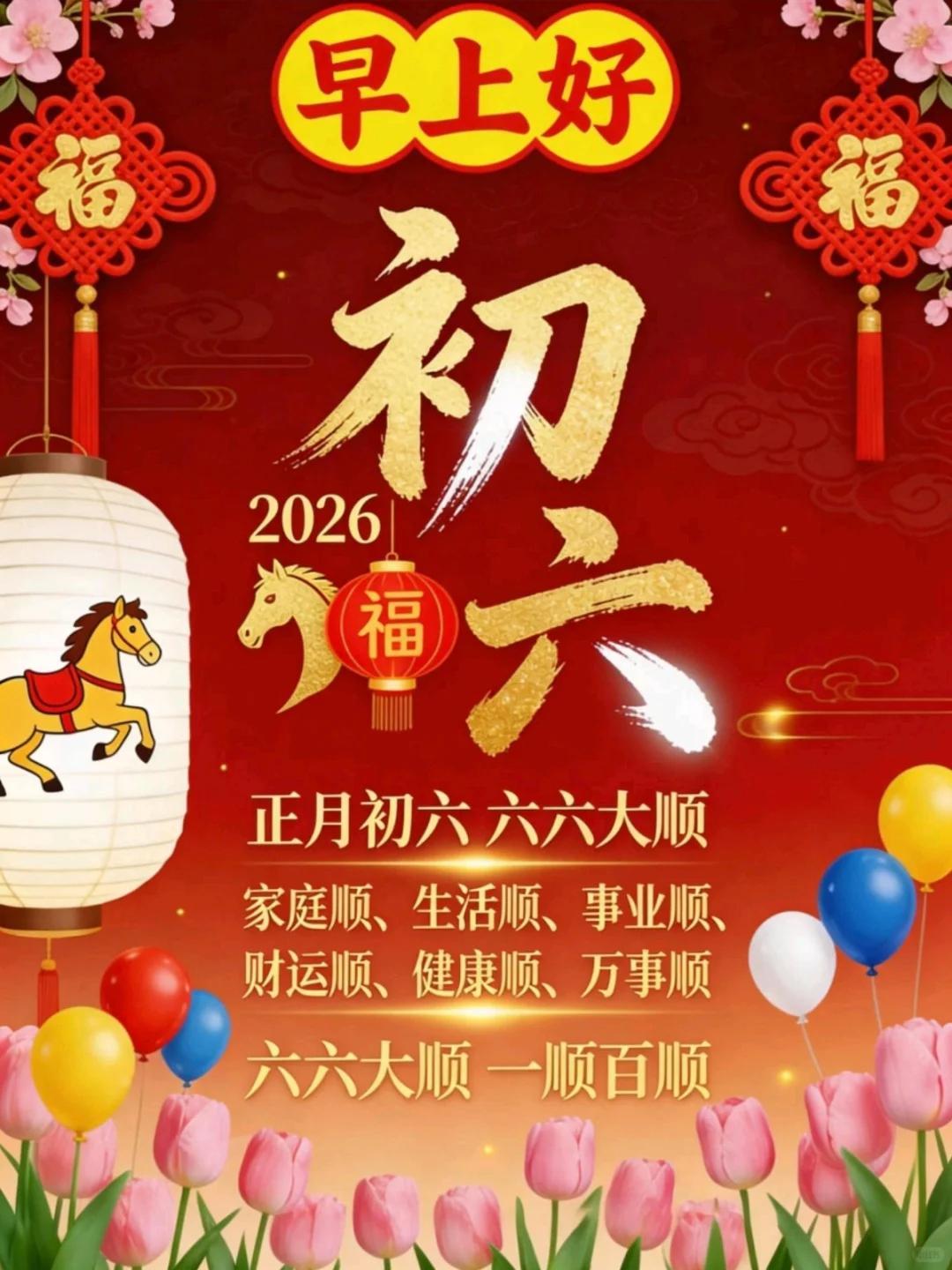 大年初六福满门,六顺临家万事兴。长寿富贵康宁聚,和善吉祥好运盈。早安如意,顺遂安康。传统文化 祝福 画画 书法