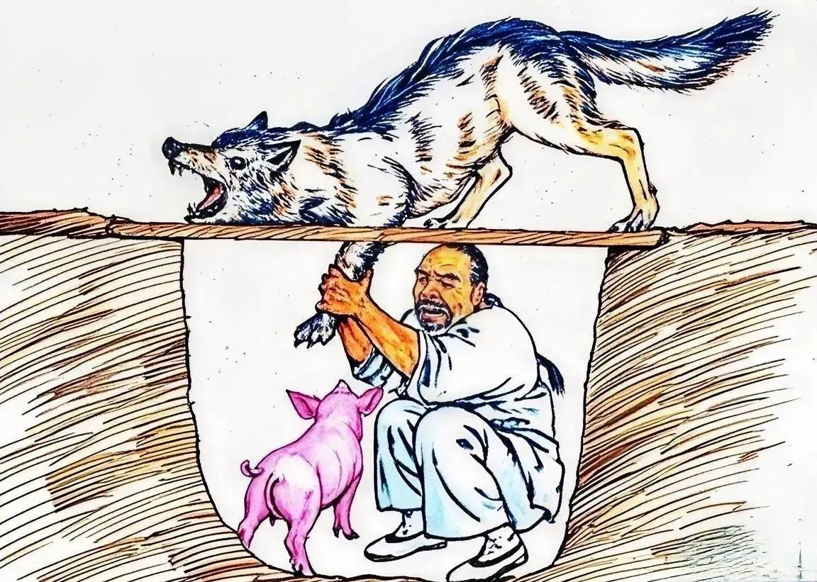 长白山,当地人逮狼有绝招儿。先在荒郊野外挖一个坑,比圆桌面稍微小点,半人深。逮狼的猎人牵一只小猪蹲在坑里,上边盖个圆桌面——桌面上有个碗口大的洞,通风透气儿。 天黑了以后,猎人就开始用荆条抽打小猪,让它一阵一阵的叫唤……狼的耳朵尖,隔着三里五里也能听见小猪叫,很快就会循着声音找到这儿来。 来的就是饿狼。要知道,狼吃饱了是不出来觅食的。饿狼围着圆桌面转了三圈儿,确信没有什么圈套,胆子大了起来,就把鼻子伸到桌面上的圆洞里去闻,哈,果然有小猪的气味儿! 它流口水,牙痒痒,肠胃也咕噜叫,馋极了,就伸进一只‘手’到那圆洞里边去捞……捞不着,就侧着身子,把整条‘胳臂’都伸了进去。 这时,那个猎人猛地拽住这只狼前腿,往肩膀上一背,使劲站直腰,连圆桌面带这只狼全都扛了起来,牵着小猪就往村里走!” 狼一点办法也没有——一只前腿被猎人死死地拽住,扛在肩上。狼身子隔着个大圆桌面,什么也抓挠不住,咬不着。虽然看得见脚下牵着的小肥猪,甩甩狼尾巴都能扫到猪身上,可一点辙也没有了!