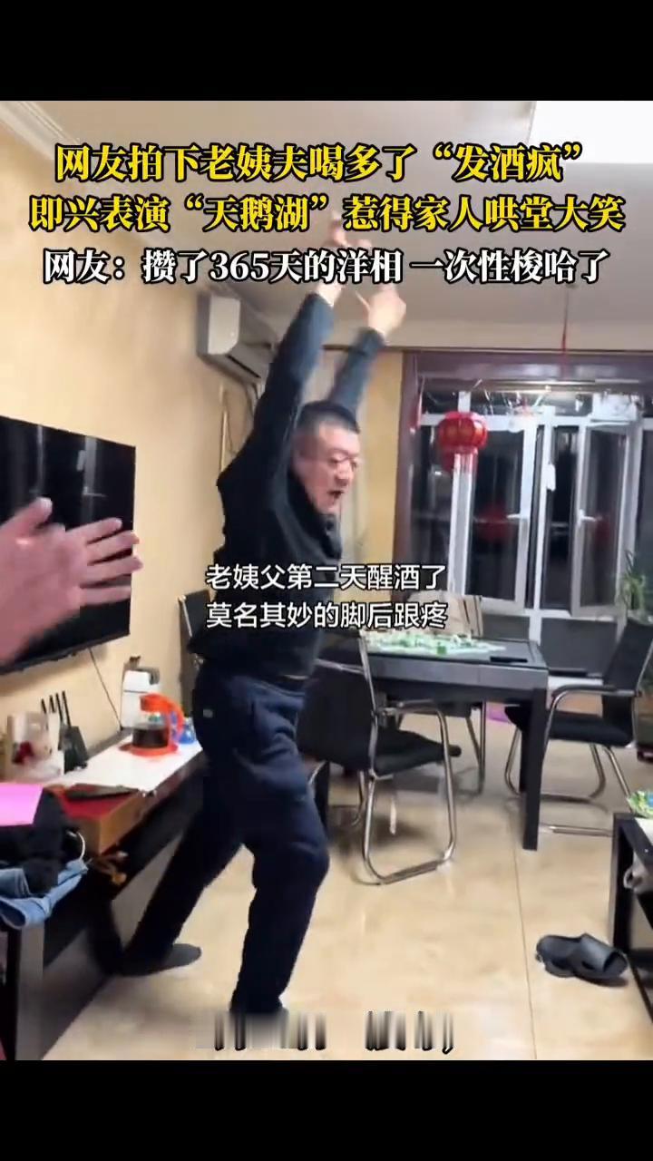 网友拍下老姨夫喝多了"发酒疯",即兴表演"天鹅湖"惹得家人哄堂大笑。 网友:攒了365天的洋相一次性梭哈了。老姨父第二天醒酒了,莫名其妙的脚后跟疼,属实绷不住,笑得停不下来。
