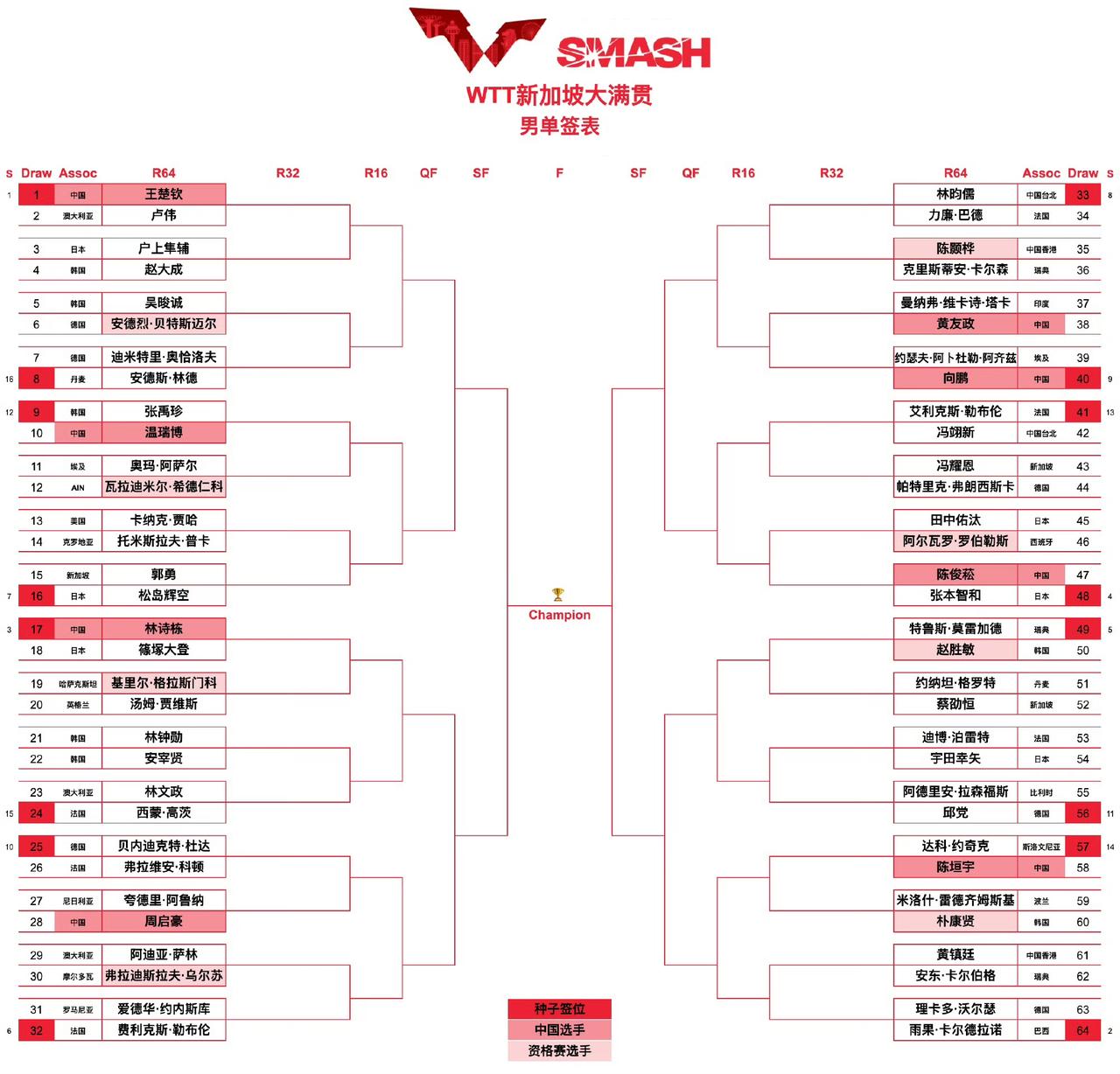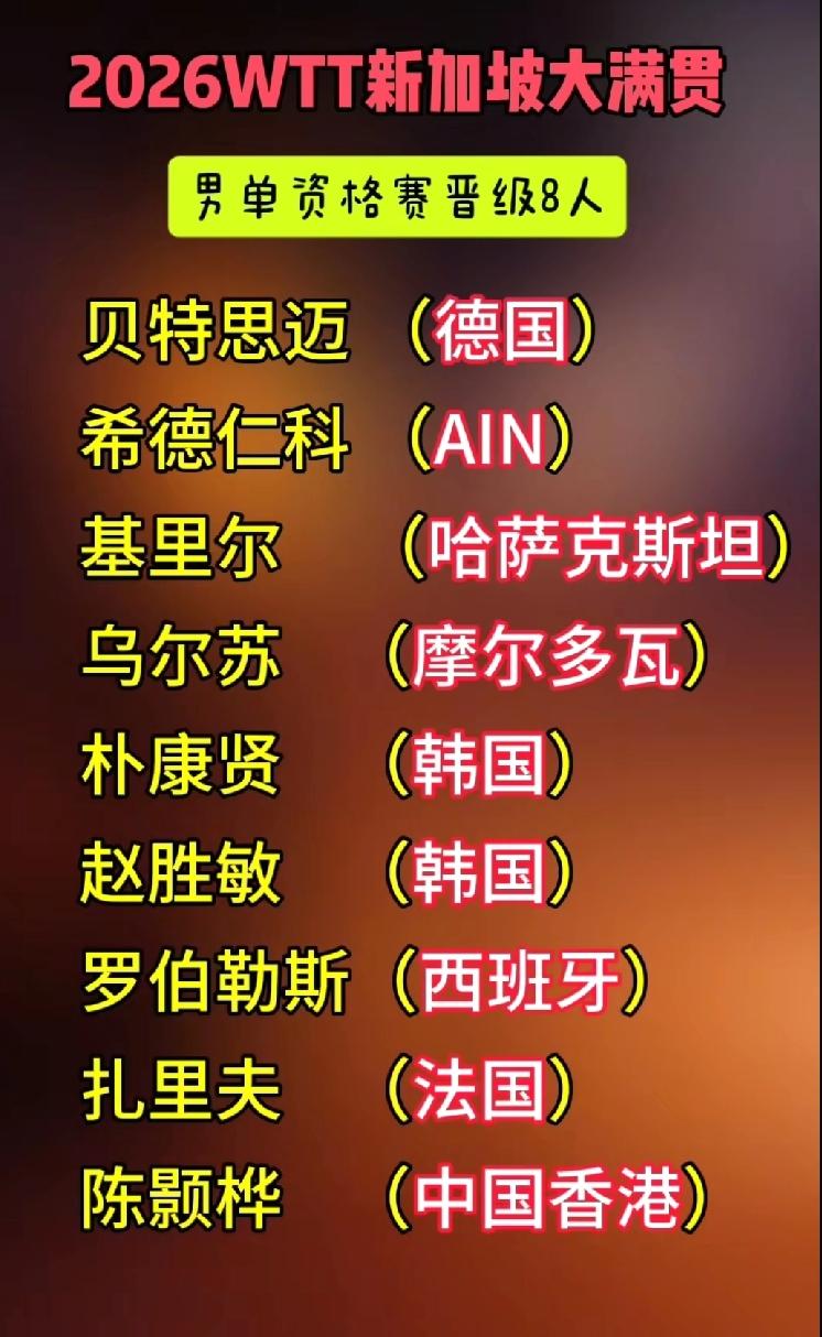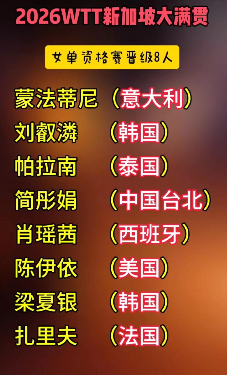 新加坡大满贯赛,陈颢桦和简彤娟资格赛成功突围 2月21日,WTT新加坡大满贯赛资格赛三轮战罢,八强诞生。 男单,包括中国香港陈颢桦在内的8人晋级正赛。众人关注的伊朗小子本雅明法拉吉资格赛第一轮就出局,中国台北新秀张佑安资格赛第三失利。 女单,包括中国台北简彤娟在内的8人晋级正赛。美国的陈伊衣和韩国的刘㕡潾连过三关打进正赛真是意外。 资格赛男女八强名单和完整签位表参看下图。