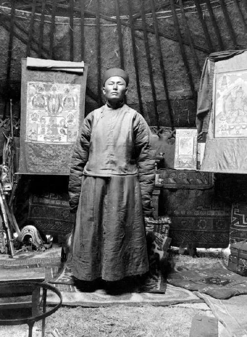 1906年,新疆伊犁河畔的一座蒙古包里,一位蒙古族男子正站在自己的毡房中央。他身着中式长袍,头戴小帽,神情沉稳。 照片中的男子身处一座典型的蒙古包内,毡房内壁挂着精美的唐卡(藏传佛教卷轴画),地上铺着华丽的地毯,旁边还摆放着木箱、武器和生活用品,这些细节都彰显了主人的财富与地位。 这张照片并非出自中国摄影师之手,而是由一位身份特殊的外国人——后来的芬兰总统卡尔·古斯塔夫·埃米尔·曼纳海姆(中文名马达汉)所拍摄,当时他以沙俄军官和探险家的身份,对中国西部进行秘密考察。在1906至1908年间,他穿越新疆、甘肃等八省,行程1.4万公里,留下了大量珍贵影像,这张照片正是其中之一,记录了当时游牧民族的生活状态。