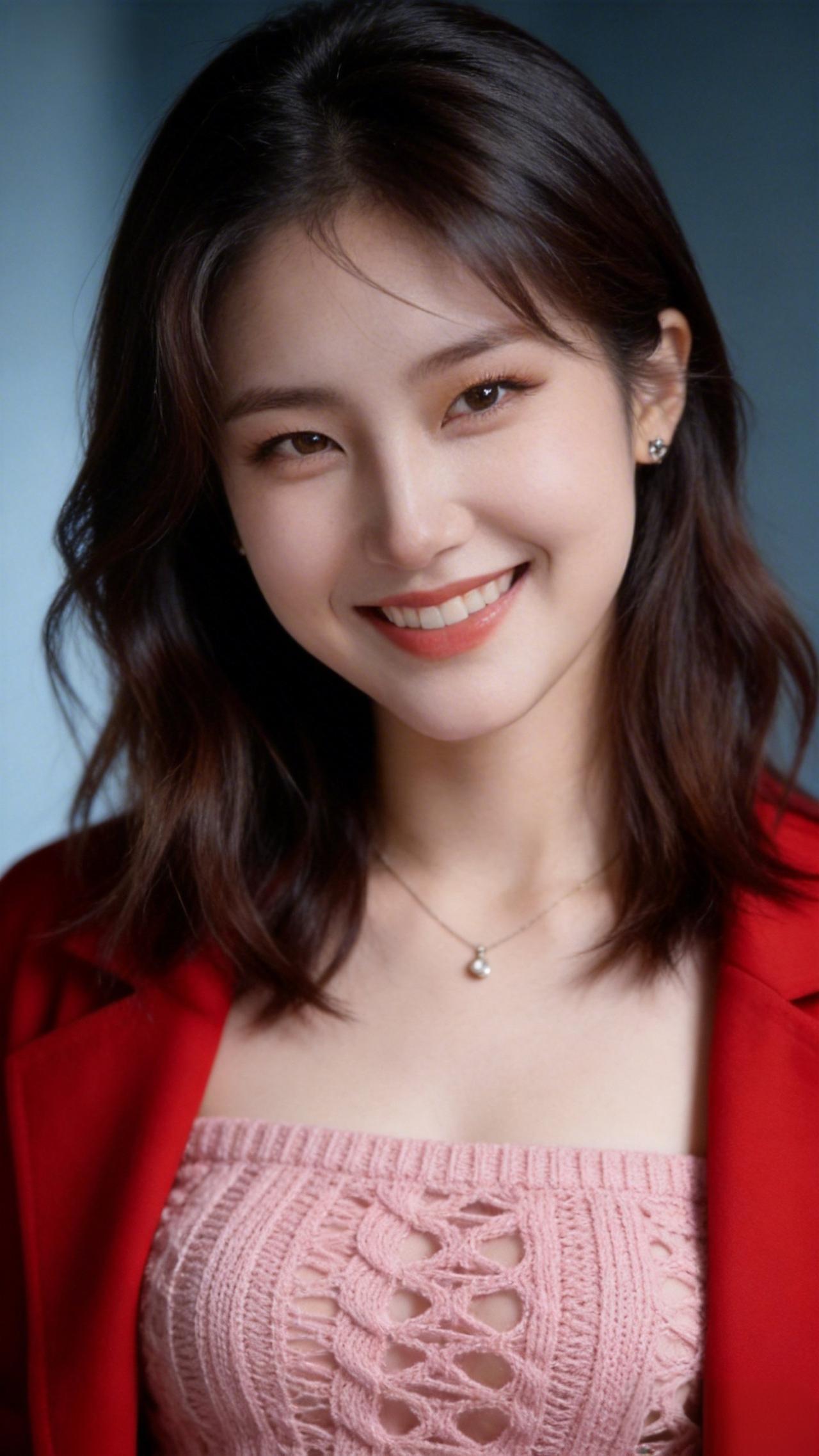 甜美笑容,红衣少女,闪耀耳环,温暖氛围