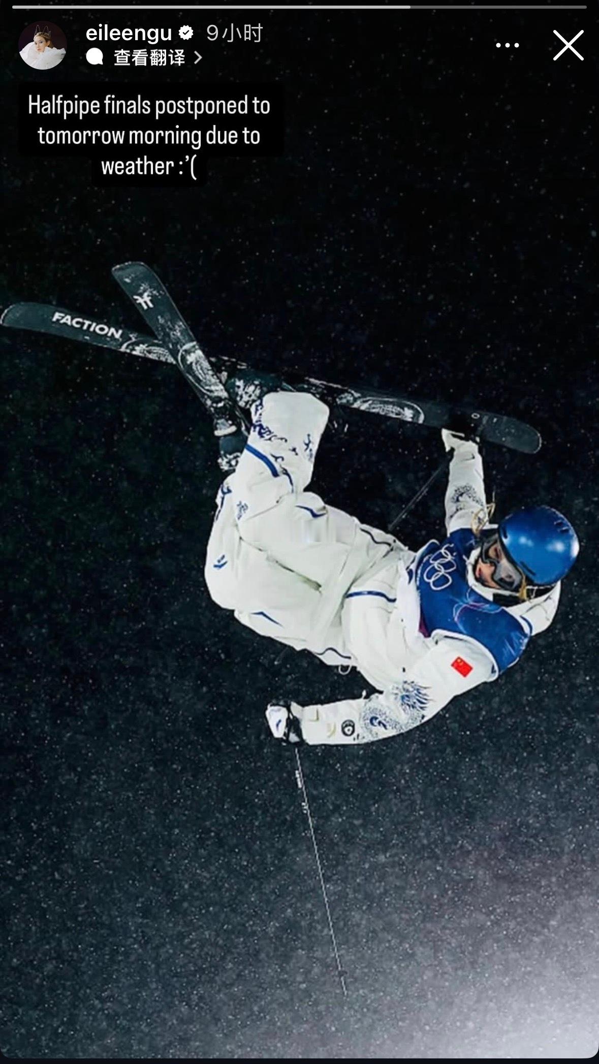卫冕冠军谷爱凌在社媒发布消息:U型场地决赛因为天气原因推迟到明天早上(当地时间)进行。