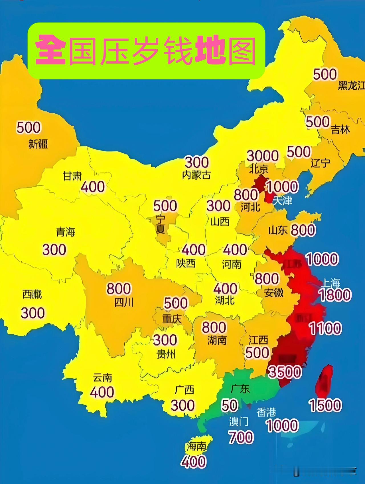 全国压岁钱地图 看看👀你的省份压岁钱是多少? 过年期间亲友大团圆,大人期盼的是和亲人的团聚,小孩儿子盼望的却是压岁钱... 七零年代的压岁钱都是几毛几块,现在的压岁钱都百元起步了,有的地方甚至是千元以上... 一个春节,压岁钱就要发出去几千块钱,一个月甚至是几个月的工资... 你认为压岁钱给多少合适? 压岁钱
