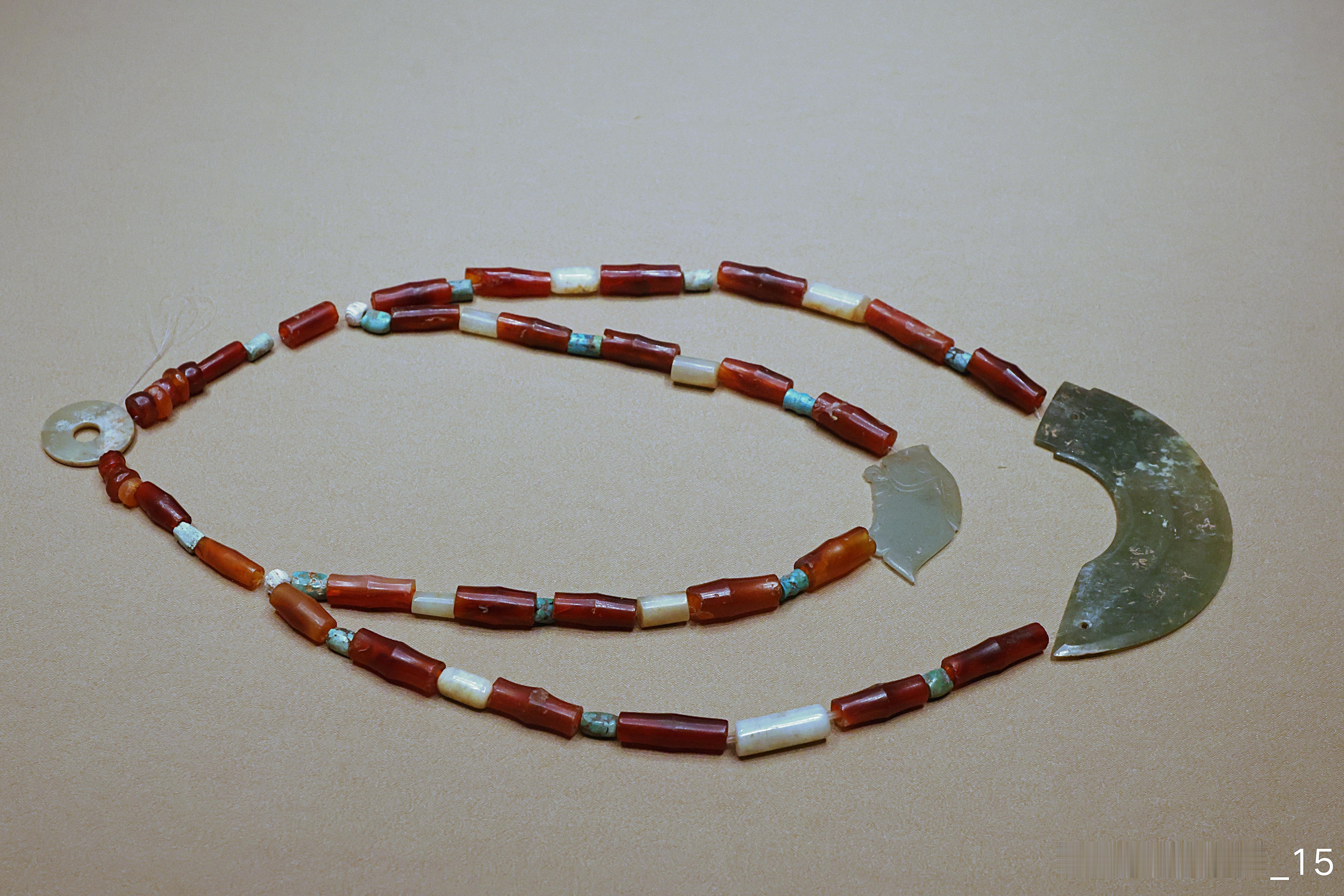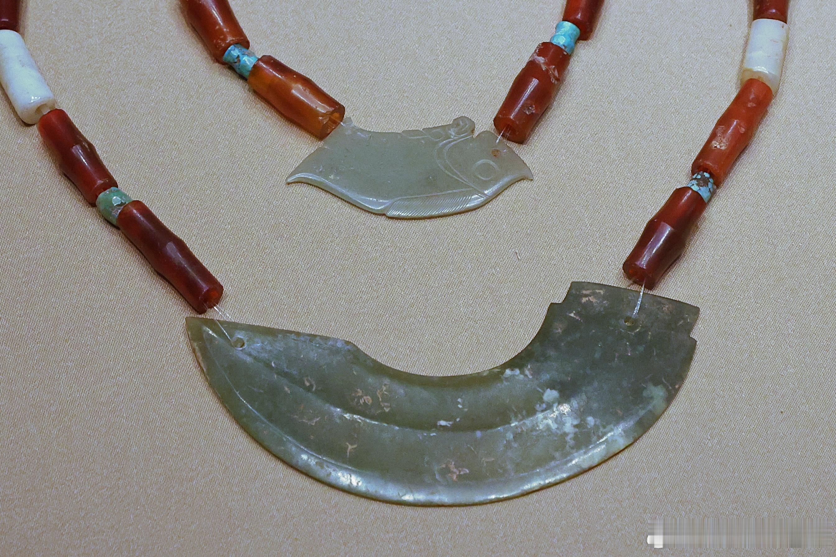 我的2026 【中国之中-中原古代文明精粹】玉组佩西周(公元前1046-前771年)河南省文物考古研究院藏平顶山应国墓地出土。这件玉佩以红色玛瑙管为主,再以绿松石、白玉管点缀其间,使其烘托出三件核心玉构件,其一最下方的玉戈形璜,其二中间的玉形玉佩,以及最上端的玉环。清华大学艺术博物馆展出2026.2.8约会博物馆文物