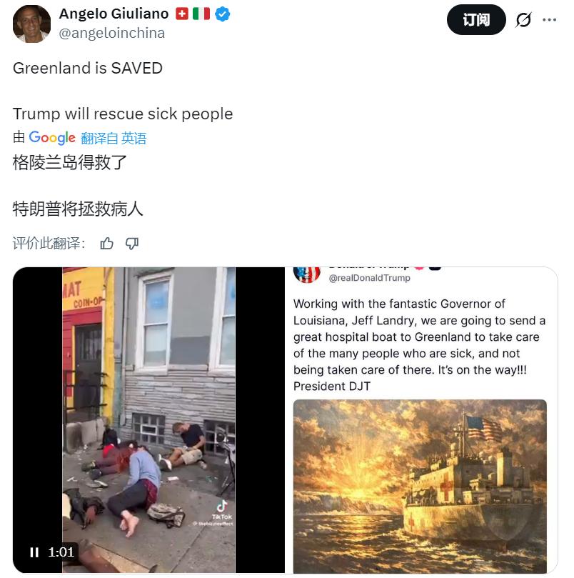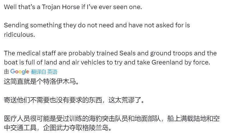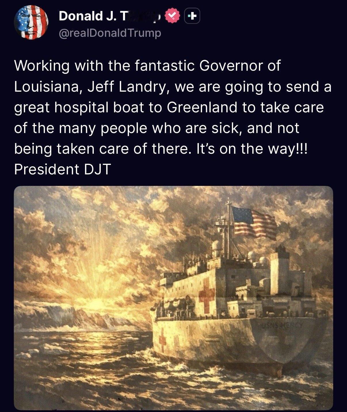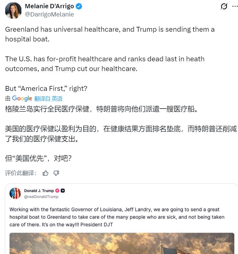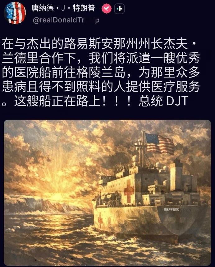 特朗普发帖称,将向格陵兰岛派遣一艘“大型医院船”,为“在那里得不到照顾的病人”提供医疗服务。