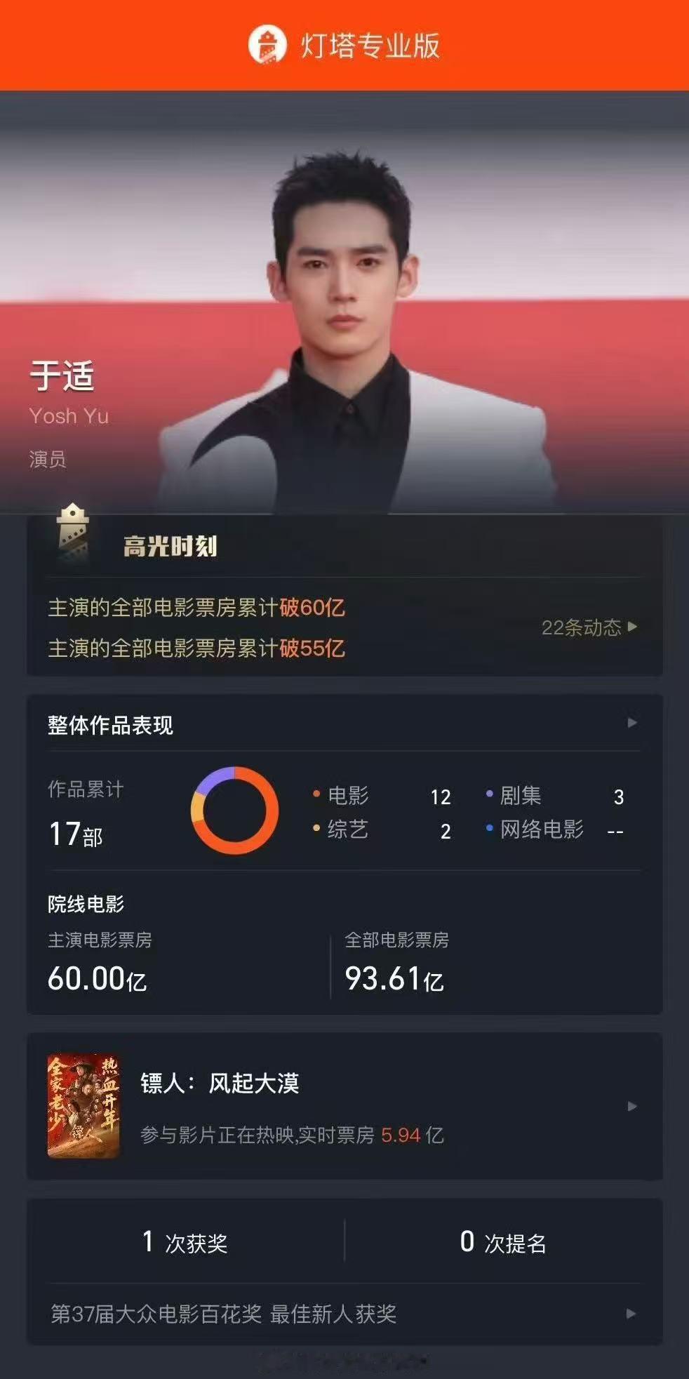 于适主演票房破60亿 实绩炸场!于适主演票房破60亿!《镖人》正在热映,他饰演的竖全程高光,银发刀疤造型辨识度拉满,高难度打戏亲身上阵,又帅又能打,票房与人气双丰收!