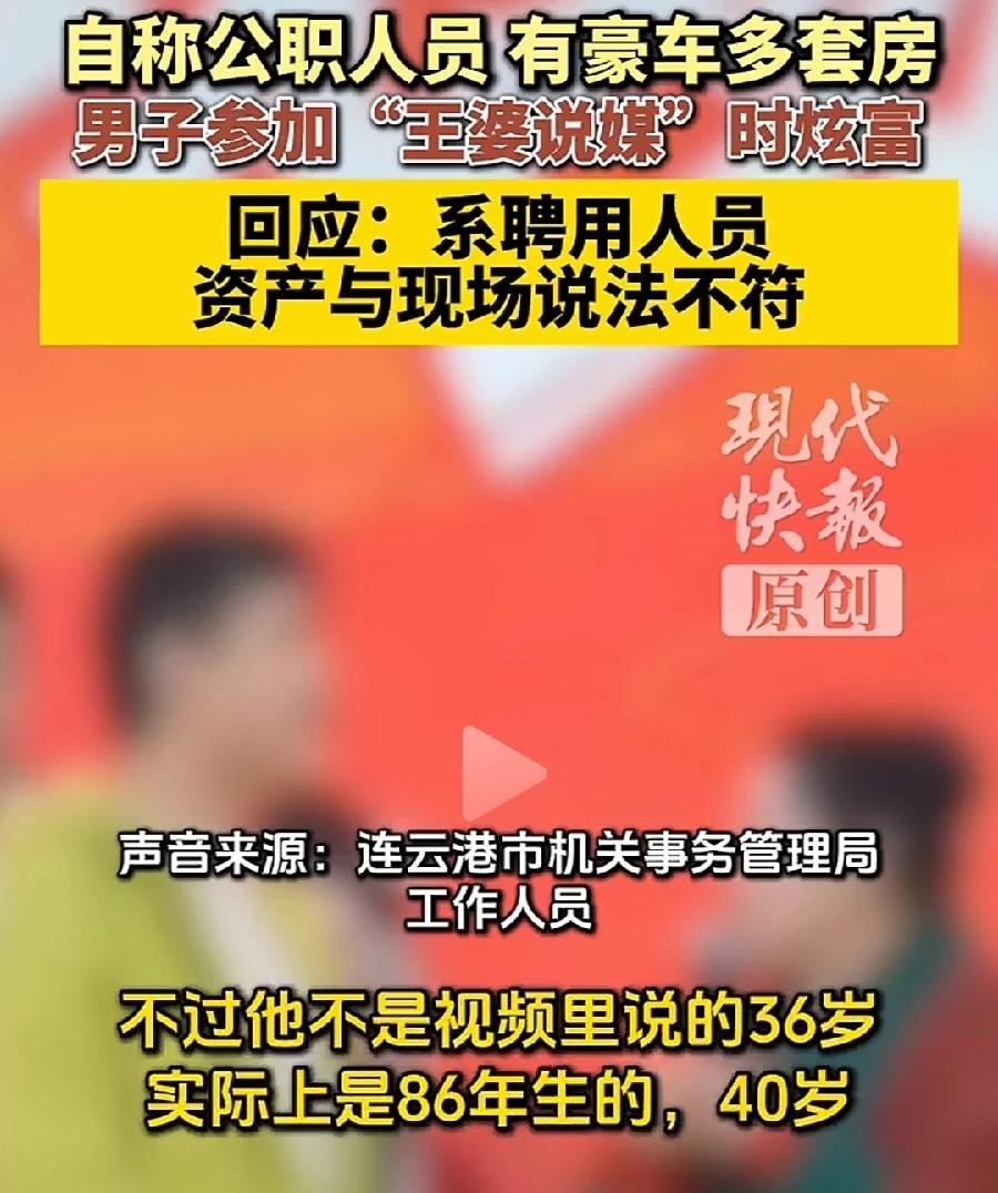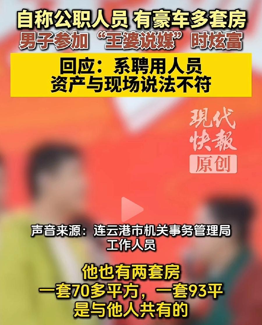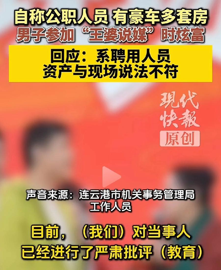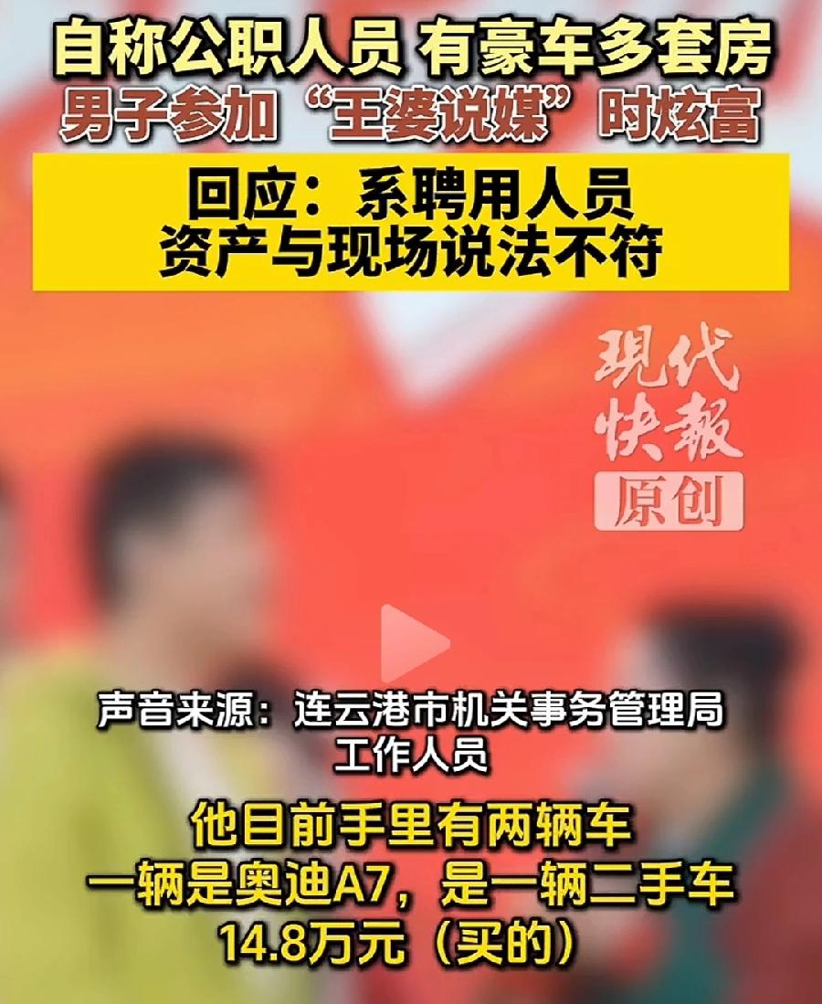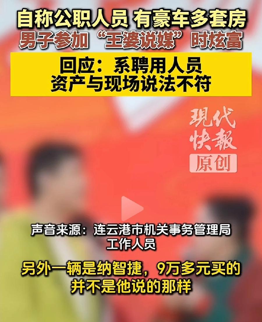 连云港机关事务局回应王婆说媒男子炫富: 1、身份、年龄。确实下属单位聘用人员,不