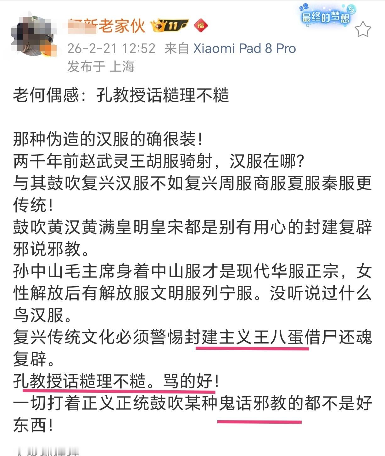 某何发文支持孔教授,还说孔教授话糙理不糙,骂得好。为什么一件小小的汉服让各路“神