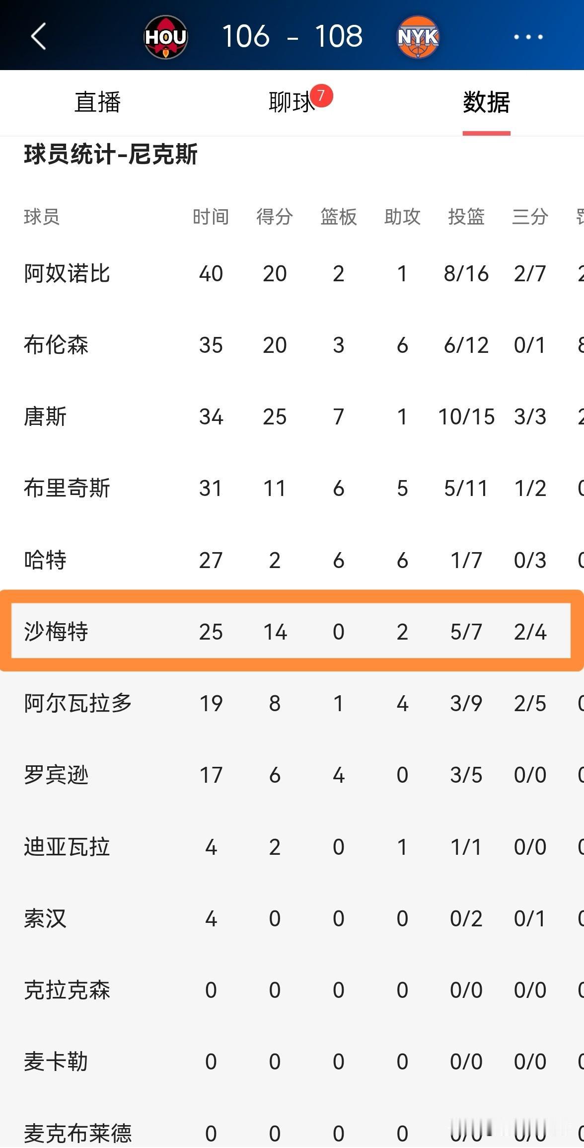 尼克斯大将沙梅特不愧是球队的替补神兵!在今天尼克斯主场以108:106逆转击败火箭的比赛中,沙梅特将替补神兵的角色演绎的淋漓尽致。 整场比赛下来,沙梅特替补出战25分钟,投篮7中5,其中三分球4中2、罚球3中2非常高效的砍下14分,还有2助攻,没有出现任何的失误,他的场上正负值为+8。 实事求是的说,以沙梅特的精彩表现来看,沙梅特完全对得起自己本赛季的年薪。