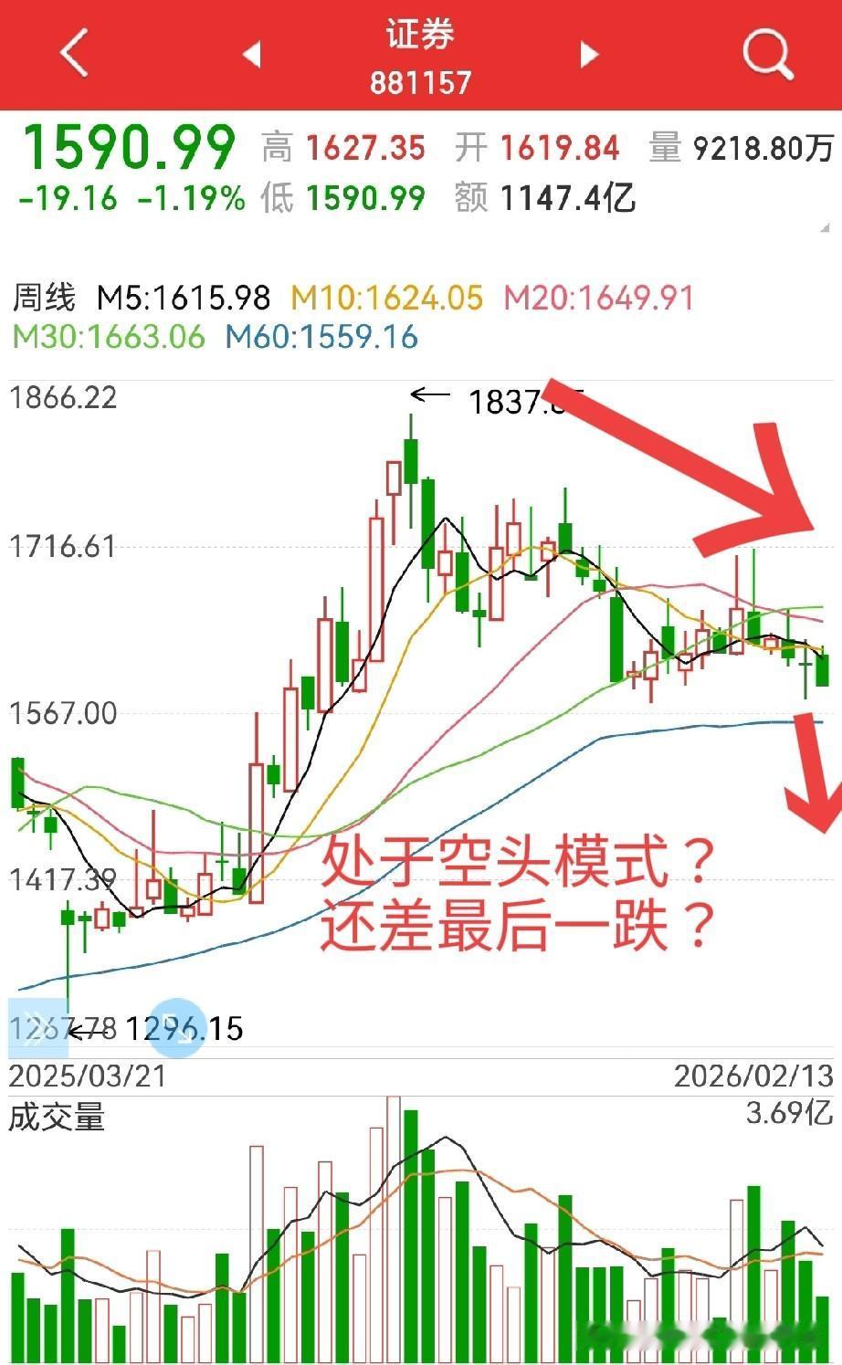 马年系列之七:今年的券商板块到底还有没有机会? 1,调整的时间及空间都没到位(下图1); 2,周线上看,还处于空头排列,有破位迹象(下图2); 3,日线上看,短线趋势也未反转。 总结: 如果单从基本面看,一片大好,且还有什么金.融.强.国什么的宏大叙事。 但是从“大兄弟”的态度看,对指数又明显比较保守,这又成了2021的翻版。没办法,谁叫券商板块在市场中的地位特殊呢。 而技术上看,也是印证了以上所述。 那么,今年的券商板块到底还有没有机会呢? 个人认为,应该还有一次中级行情,时机大概率会发生在二季度(过后),即,年报及一季报会非常亮眼,但走势可能成反比,进一步打击持有者信心,让人绝望。同时,二季度的大盘可能也有一个中期调整,双重压力之下,完成券商板块的大波段调整(最后一跌)。 然后,在指数比较难看的情况下,在中报的刺激下(当然这个只是借口),在市场再一次需要白衣骑士的时候,券商板块可能会有一波逆袭。 版本可以参考2021年三季度的煤炭板块对市场的效果,到时候又会人觉得,牛还在!