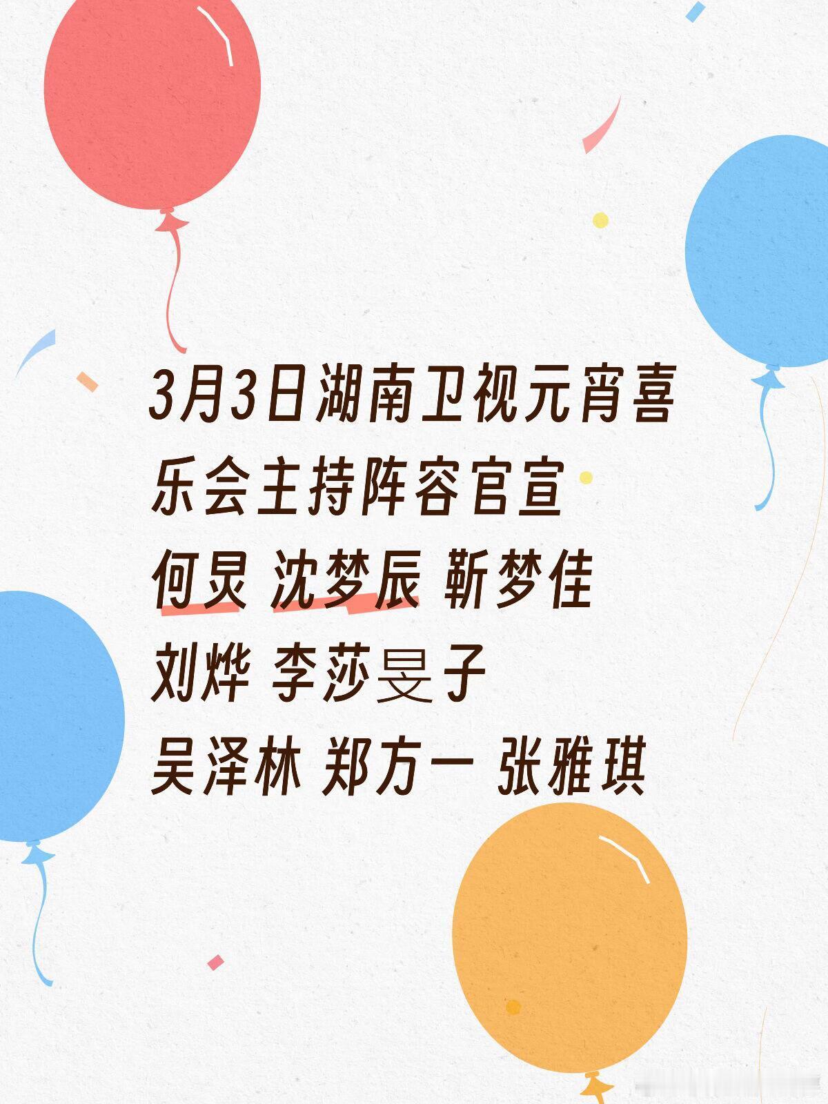 3月3日湖南卫视元宵喜乐会主持阵容官宣何炅 沈梦辰 靳梦佳 刘烨 李莎旻子 吴泽林 郑方一 张雅琪