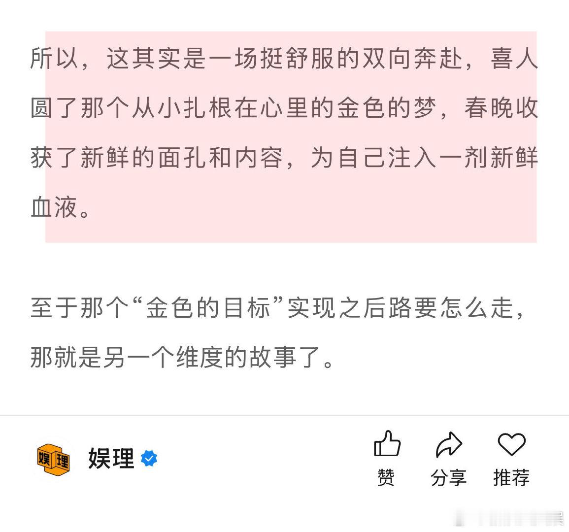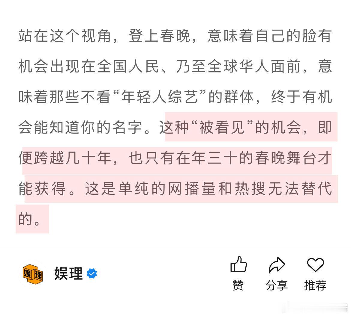 春晚能让喜人升咖吗 喜人扛起春晚半边天 登上春晚,意味着自己的脸有机会出现在全国人民、乃至全球华人面前,意味着那些不看“年轻人综艺”的群体,终于有机会知道你的名字。这种“被看见”,只有在春晚舞台才能获得。这是单纯的网播量和热搜无法替代的。娱理独家↓