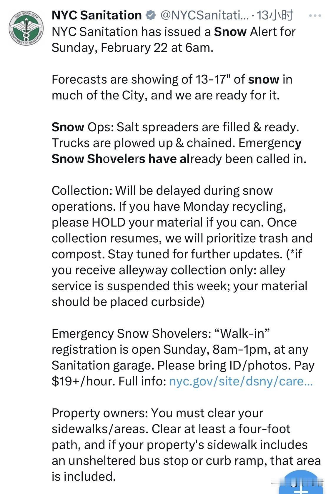 纽约市环卫部门已发布2月22日星期日早上6点的降雪警报。 天气预报显示,市内大部分地区将有 13-17 英寸的降雪,我们已经做好了准备。 除雪作业:撒盐车已装满盐并准备就绪。卡车已清理积雪并安装防滑链。紧急铲雪车已调集到位。 垃圾收集:除雪作业期间收集将延迟。如果您周一需要回收可回收物,请尽量暂缓收集。收集恢复后,我们将优先收集生活垃圾和堆肥。请关注后续更新。 (*如果您仅享受巷道垃圾收集服务:本周巷道垃圾收集服务暂停;请将您的垃圾放置在路边。 紧急铲雪志愿者:周日上午 8 点至下午 1 点,可前往任何环卫站进行现场登记。请携带身份证件/照片。时薪 19 美元起。 业主:您必须清理人行道/区域。至少清理出一条四英尺宽的小路,如果您的物业人行道包含无遮挡的公交车站或路缘坡道,则该区域也包含在内。