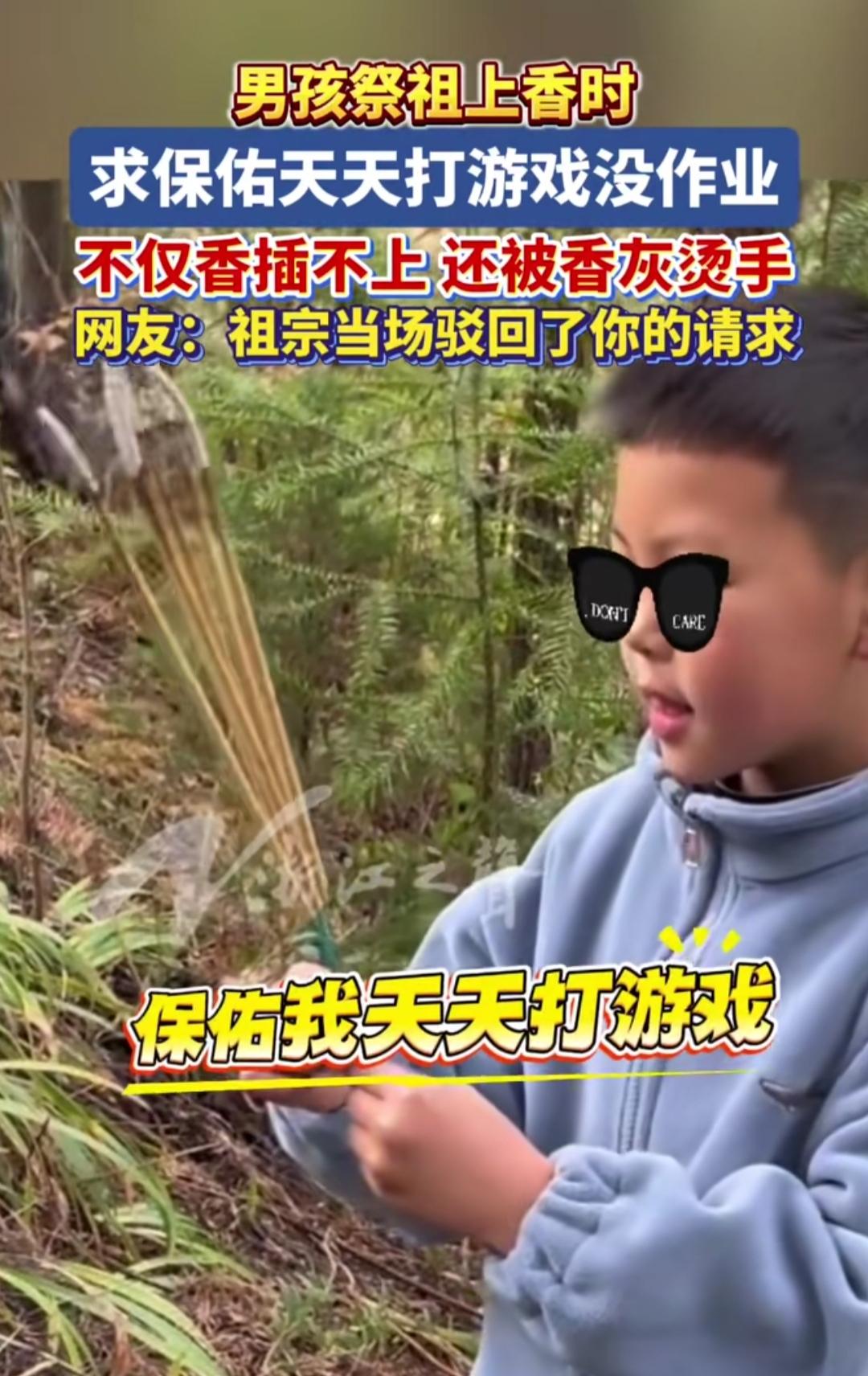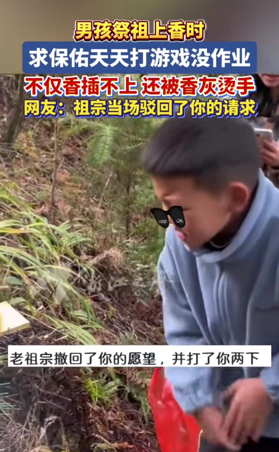 谁能想到祭祖上香还能遇上这事儿!一个小男孩祭祖时的许愿,竟被老祖宗用特别的方式回应,好笑的背后,还藏着戳中所有人的小细节。 小男孩捧着香超虔诚,许愿想天天打游戏还没作业,结果话音刚落,手就被香灰烫到了。他不死心降低要求再许愿,没想到同一位置又被烫,瞬间委屈拉满,那模样又可怜又好笑。 网友们都被这幕逗乐了,纷纷调侃这是老祖宗当场“拒绝请求”。这孩子气的小心愿,是不是让你想起了小时候的自己?那些藏在心底的小期盼,原来不管什么时候都一样天真。