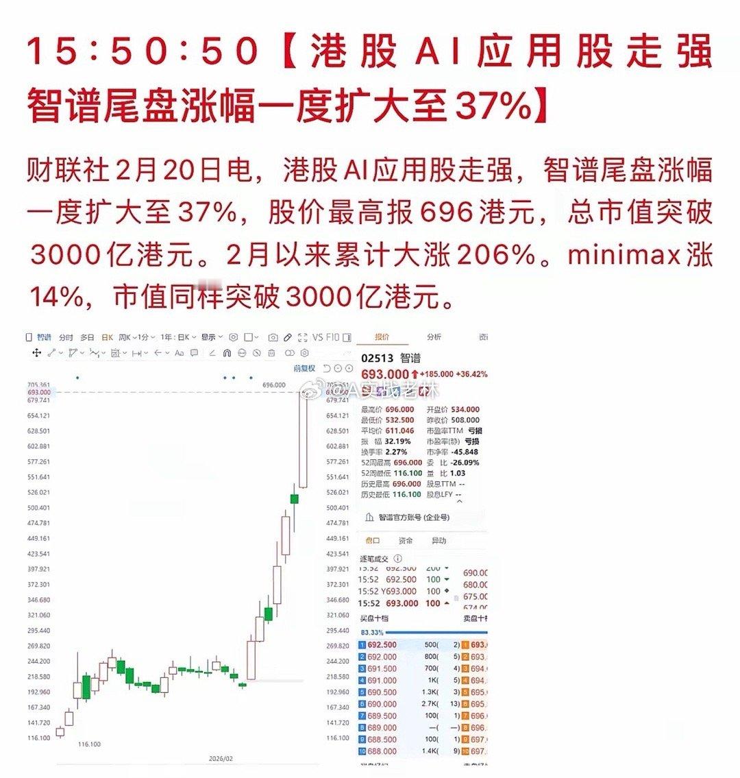 春节假期期间,港股(智谱)大涨近40%!A股关联AI应用的个股一览:1、智谱AI爆拉,直接点燃全AI板块情绪!本质就一句话:大模型技术迭代+商业化提价,实锤AI从讲故事的技术驱动,正式切到真金白银的需求驱动。2、吃肉方向很明确:大模型、算力(芯片/服务器/光模块)、云资源、AI应用。3、智谱A股核心受益公司:1)第一梯队:股权绑定(最正宗、弹性最大)• 电广传媒 000917旗下达晨财智间接持股智谱约7.54%,A股持股比例最高,纯纯“智谱影子股”,估值修复空间最大。• 奥飞数据 300738战略投资+生态基金双绑定,算力+资本双重受益,合作从基建渗透到车载Agent应用。• 湖南发展 000722间接参股,弹性小票,适合短线博弈。2)第二梯队:算力基建(订单确定性最强)• 中科曙光 603019智谱核心算力供应商,服务器+智算集群主力,国产算力标杆。• 首都在线 300846智算云平台部署GLM大模型,边缘推理+算力租赁,弹性高、股性活。• 神州数码 000034算力分销+智算服务,大模型商业化放量直接受益。• 凌云光 688400光模块+智能视觉,适配大模型高速传输与多模态算力需求。3)第三梯队:芯片/硬件(底层刚需)• 海光信息 688041DCU深度适配GLM-5,推理加速、国产替代核心标的。• 寒武纪 688256云端AI芯片,大模型训练/推理刚需,算力爆发直接受益。4)第四梯队:应用生态(商业化变现)• 金山办公 688111WPS AI深度集成GLM-5,3亿月活+付费提价,业绩兑现最确定。• 蓝色光标 300058AI营销+内容生成接入GLM,降本增效+客户提价,弹性大。• 视觉中国 000681多模态数据合作,大模型语料/版权合规核心供应商。• 东华软件 002065行业大模型落地,政企场景深度绑定智谱生态。• 每日互动 300766数据服务+AI应用,受益大模型商业化扩圈。4、一句话总结:做弹性:电广传媒、首都在线、凌云光做稳健:中科曙光、金山办公、海光信息做应用兑现:蓝色光标、视觉中国、东华软件核心变量:智谱商业化进度、算力订单、应用付费率,不看故事看落地。