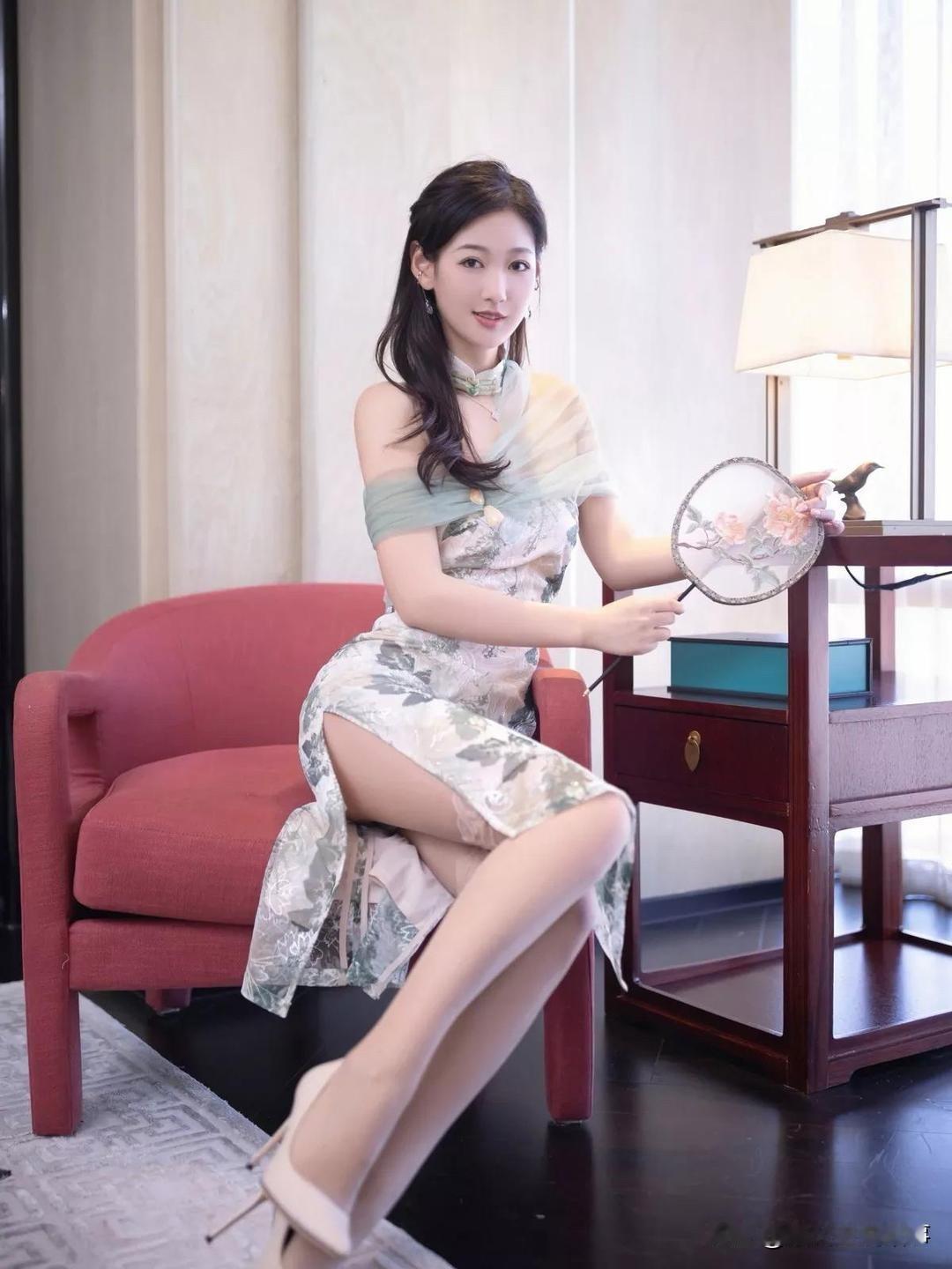 "优雅坐姿,轻拢慢捻,古典韵味在指尖流转。"长腿女神唐安琪旗袍小妈甜风旗袍图