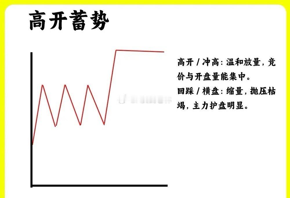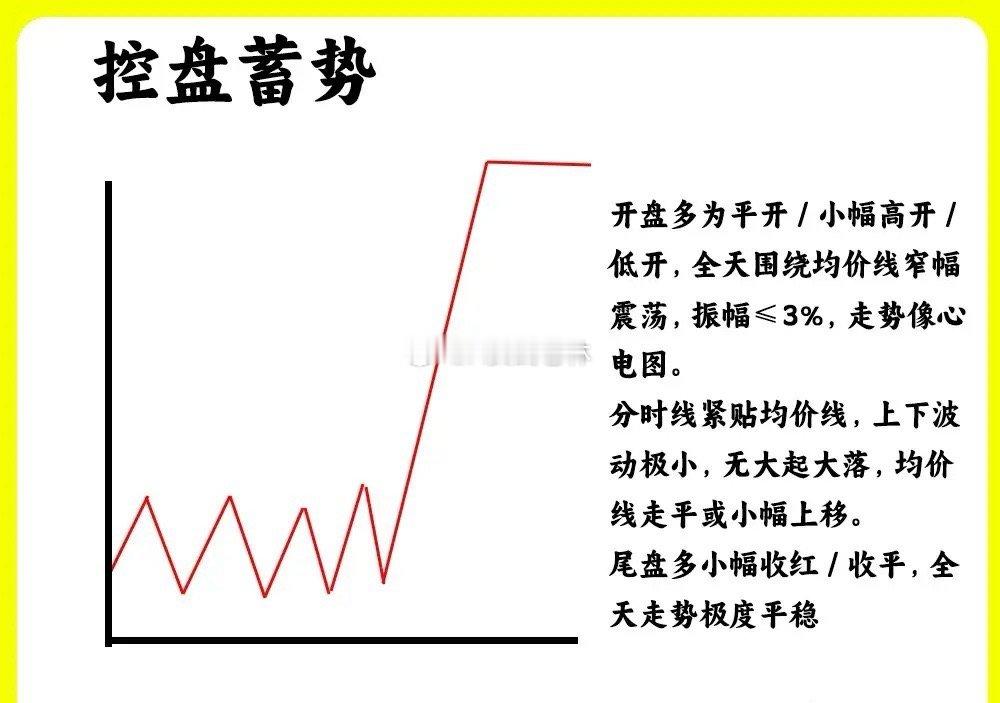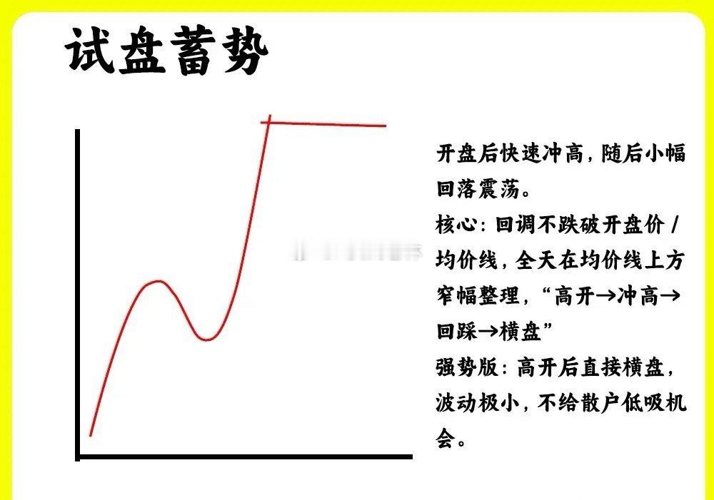 注意了!主力不管是在低位阶段还是上涨的中继,主力都会做一个动作那是蓄势,积蓄能量。在分时图里,我总结了三种主力蓄势的手法。如果你都是看分时图,那这期内容就一定要认真看完还是老规矩,点赞收藏或评论888支持一下,老林每天分享炒股干货,以免以后想温习找不到了一、试盘蓄势早盘小幅低开或是平开,在早盘里,股价开始出现放量上涨,上涨5%左右,形成脉冲式上涨,随后股价开始回调,形成冲高回落,回调的过程里,成交量出现缩量,很平稳。整个过程股价都没跌破均价线,随后股价继续拉升,抛售的筹码出现承接。早盘的上涨是为了测试上方的抛压情况,股价自由下落是为了测试下方的承接力量。这是第一种试盘蓄势形态二、高开蓄势早盘高开1%到3%左右,随后股价继续温和放量的上涨,随后开始回落,下跌幅度不大,而是开始走横盘震荡的一个走势,回调的过程里,股价都没有跌破重要的位置,比如开盘价或是昨日收盘价。总的来说说,分时走势就是高开以后,冲高、再回落,走窄幅震荡的一个走势,这是一个很标准的蓄势形态,这种形态一般是突破重要压力位或是主升浪的初期阶段。三、主力控盘蓄势股价早盘低开或是平开,随后股价开始横盘震荡,整个震荡过程,涨跌幅都在3%以内,上下波动比较小。走势一直在均价线附近运行。蓄势的过程里,成交量全天都没有多少 量,都处于缩量的状态。这是主力利用长时间的震荡,来消耗大家的耐心。等到尾盘收盘,往往也是收平或是小幅度的收红。这种形态比较磨耐心以上就是分时蓄势的三种形态,而且比较常见。希望对大家有启发