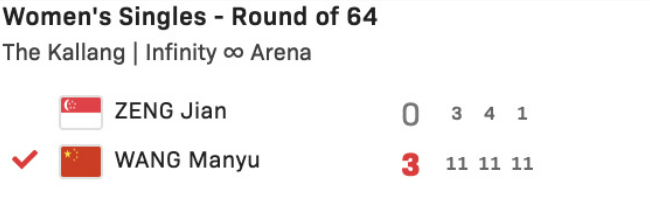WTT新加坡大满贯第一轮,王曼昱3-0战胜曾尖,整场比赛只让对手拿到了8分。