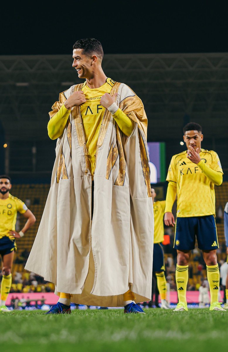 赛后,C罗披传统服饰Bisht长袍,庆祝2月22日的沙特国庆!
