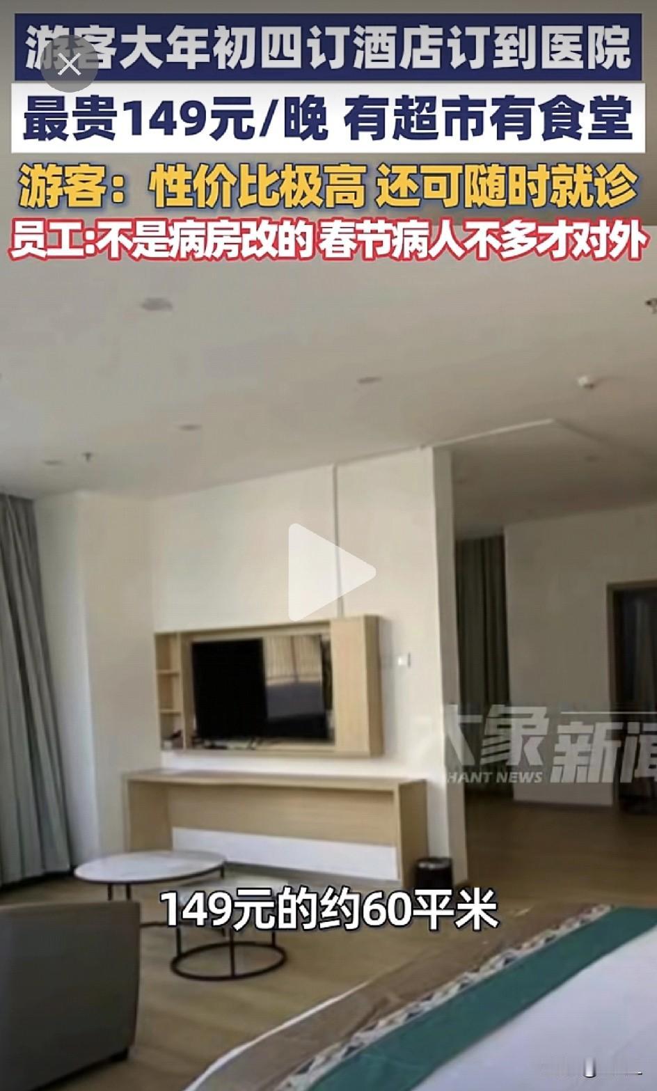 笑疯!大理春节订酒店直接订进医院!149元住套房,春节一分不涨!关键安全值直接拉满! 春节去大理玩的朋友都知道,古城周边的酒店简直贵到离谱,随便一间就要上千块,最重要的还是一房难求! 可就有位游客,大年初四直接订到了一个全网最特殊的住处——医院里的住宿中心! 没错,真的是云南省滇西中心医院,专门把5楼一整层做成了住宿中心,不是病房改造,今年刚开业没多久,干净、消毒全到位,网友直接笑喷:安全感直接拉满! 这里配套比酒店还全: 地下两层停车场,一楼平价超市,价格和外面一样;负一楼就是食堂,还有大理本地特色菜;24小时保安值班,万一身体不舒服,下楼就是门诊急诊,看病一步到位。 最绝的是价格! 109元住30㎡单间,149元住60㎡大套房,春节旺季一分钱不涨,总共就30间房,过年期间直接住满! 医院工作人员说,这个住宿中心本来是给病人家属准备的,因为春节病人少,才临时对外开放,离大理古城大概20公里。 游客直言:旺季想省钱,这地方简直是天花板! 不少网友调侃: “别的不管,消毒卫生绝对放心,这才是大理最有特色的‘网红酒店’!” “真正打败你的不是同行,而是外行!不,是外科!” “这个真好,每个医院都应该配套上酒店,方便家属,价格实惠!” 也有人表示毕竟是医院,大过年的去住到医院,心里总是有点忌讳。 大家怎么看?你会选择这样性价比很不错的住宿中心吗? 素材来源:大象新闻,侵联删!
