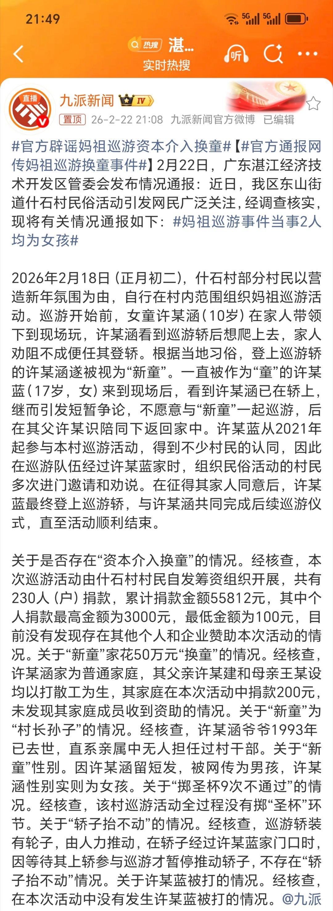 官方通报网传妈祖巡游换童事件说的很详细,原来那个“小男孩”是小女孩 这10岁小孩一身红衣很好看很喜庆……