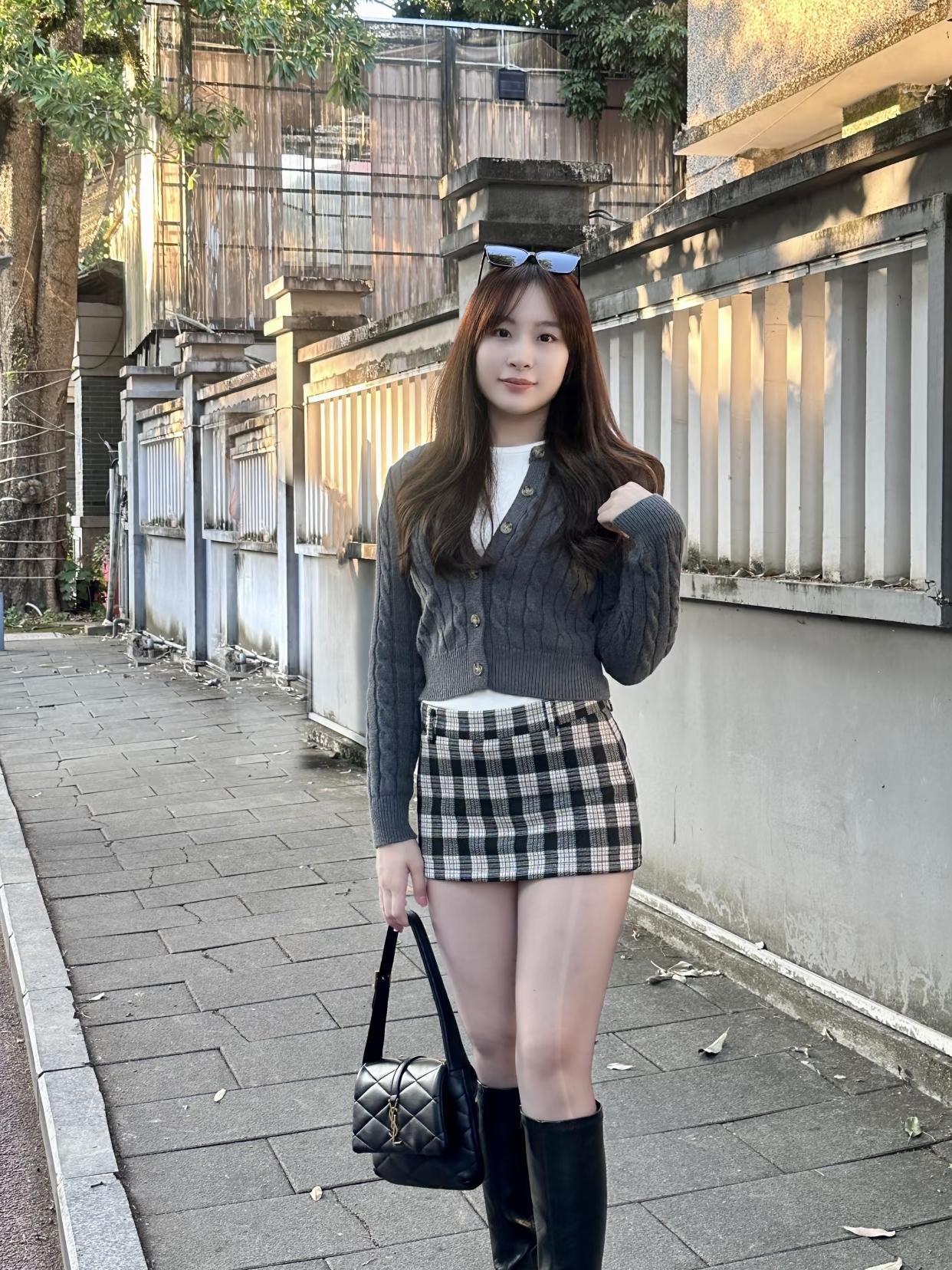 春街偶记 文/朱珠 晴光漫过老墙西,树影斑驳石路齐。 麻灰短衫拧花纽,黑白格裙裹腰脐。 长靴亮似新磨镜,小挎包儿坠臂低。 立住偷瞄墙缝草,蹲来轻拍靴头泥。 暖阳晒得浑身懒,不赶车来不赶题。 寻常巷陌寻常景,自在春风自在兮。