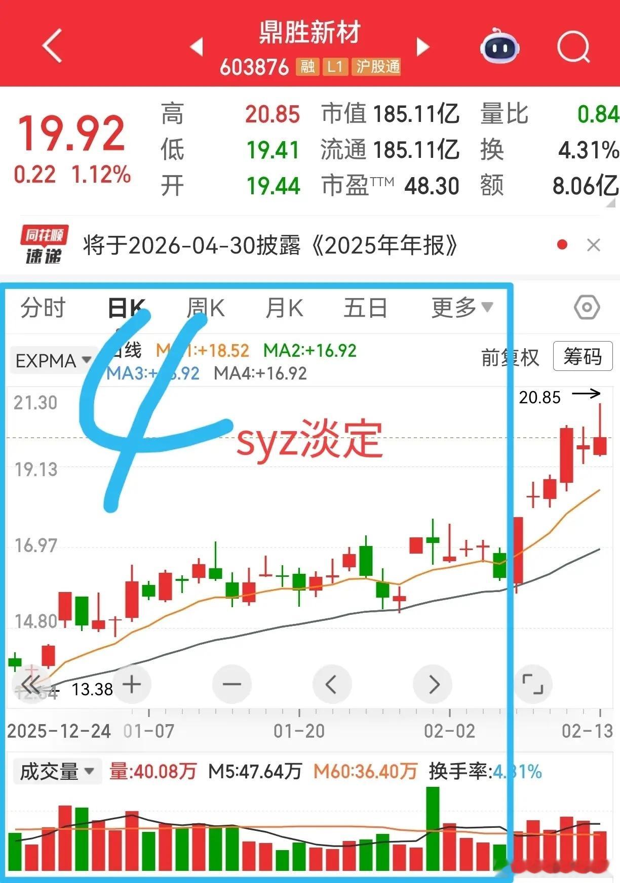 鼎胜新材:缩量靠生命线,趋势未改,次日涨停