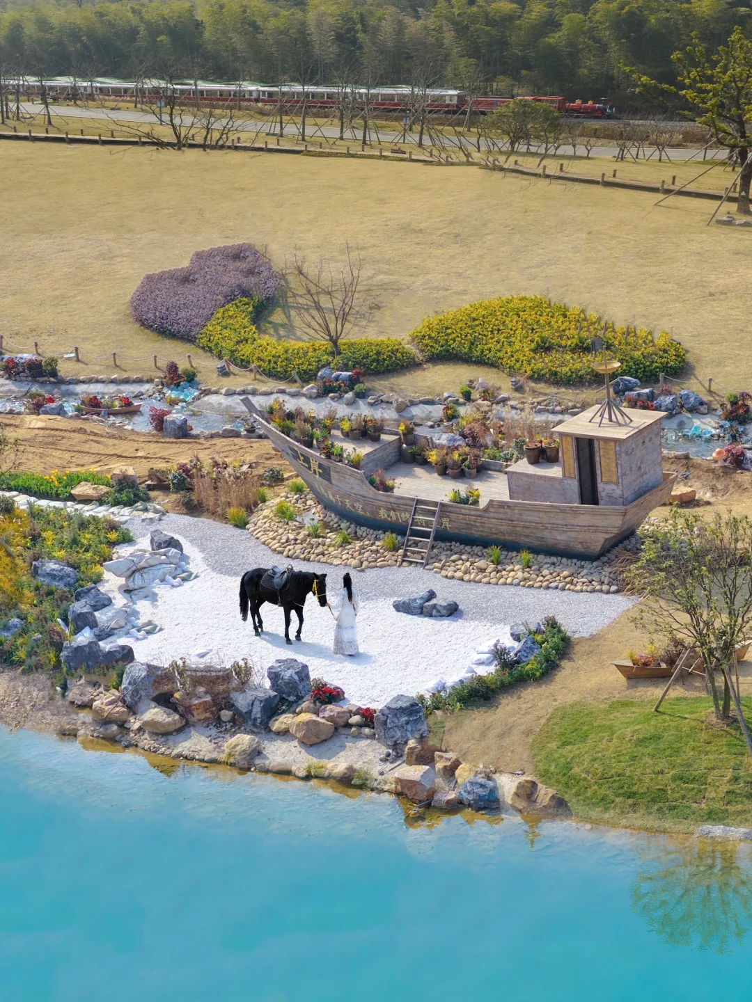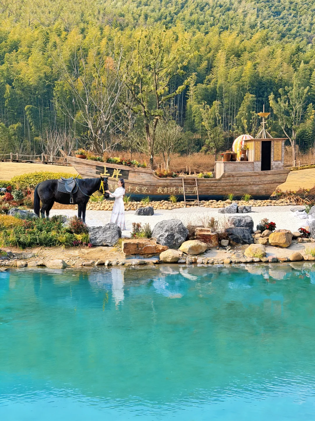 被绿意与清风包围,远离小镇喧嚣,骑上马漫步在这片原野,不远处还有一艘“上岸”的大船