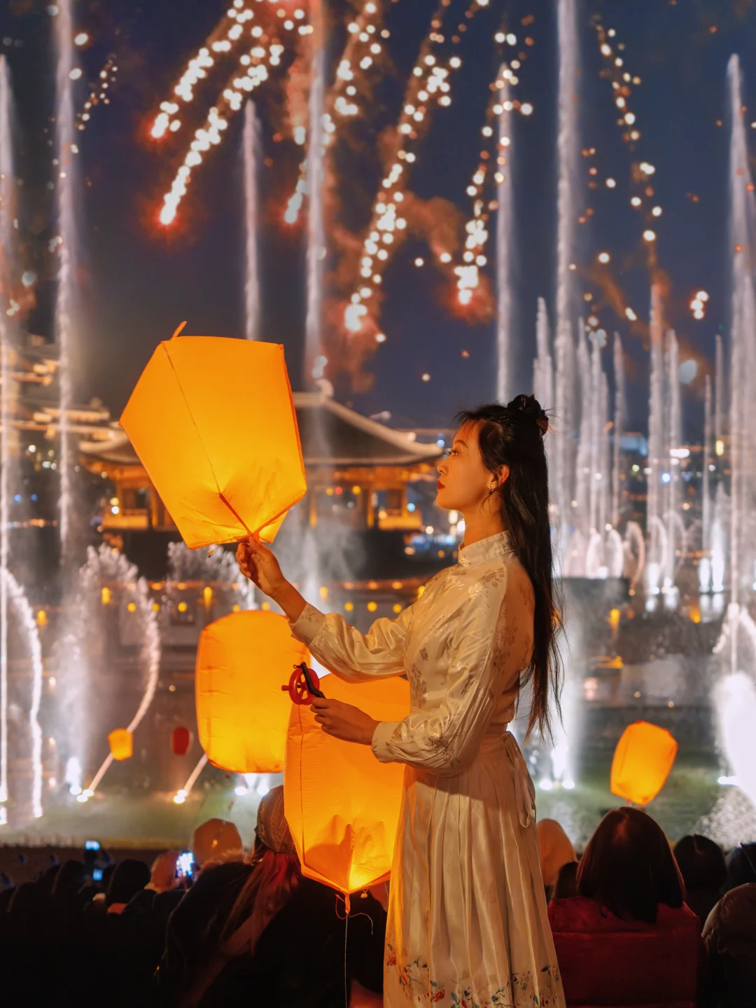 一场水与火的交融,光与水随音乐在夜空共舞,璀璨烟花绽放,手中盏盏心愿灯,悠悠升空,化作点点星光