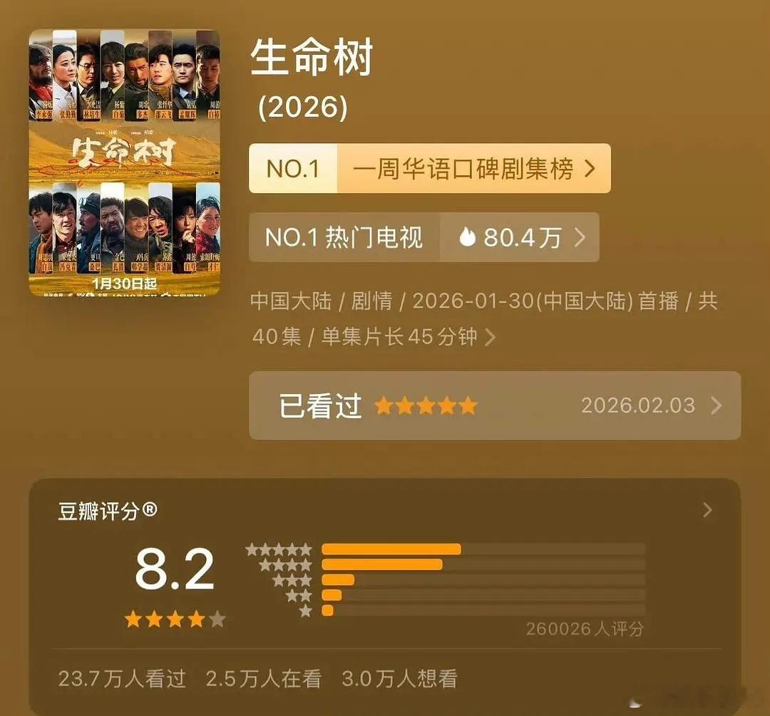 生命树口碑大出圈!豆瓣26万人打8.2分!抖音播放量已74亿!爱奇艺品牌数史冠!