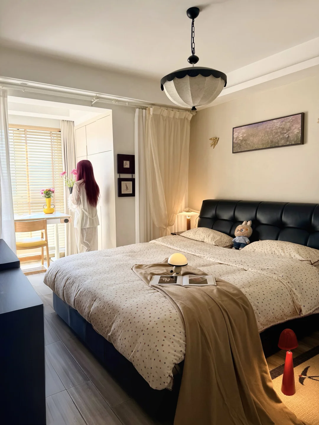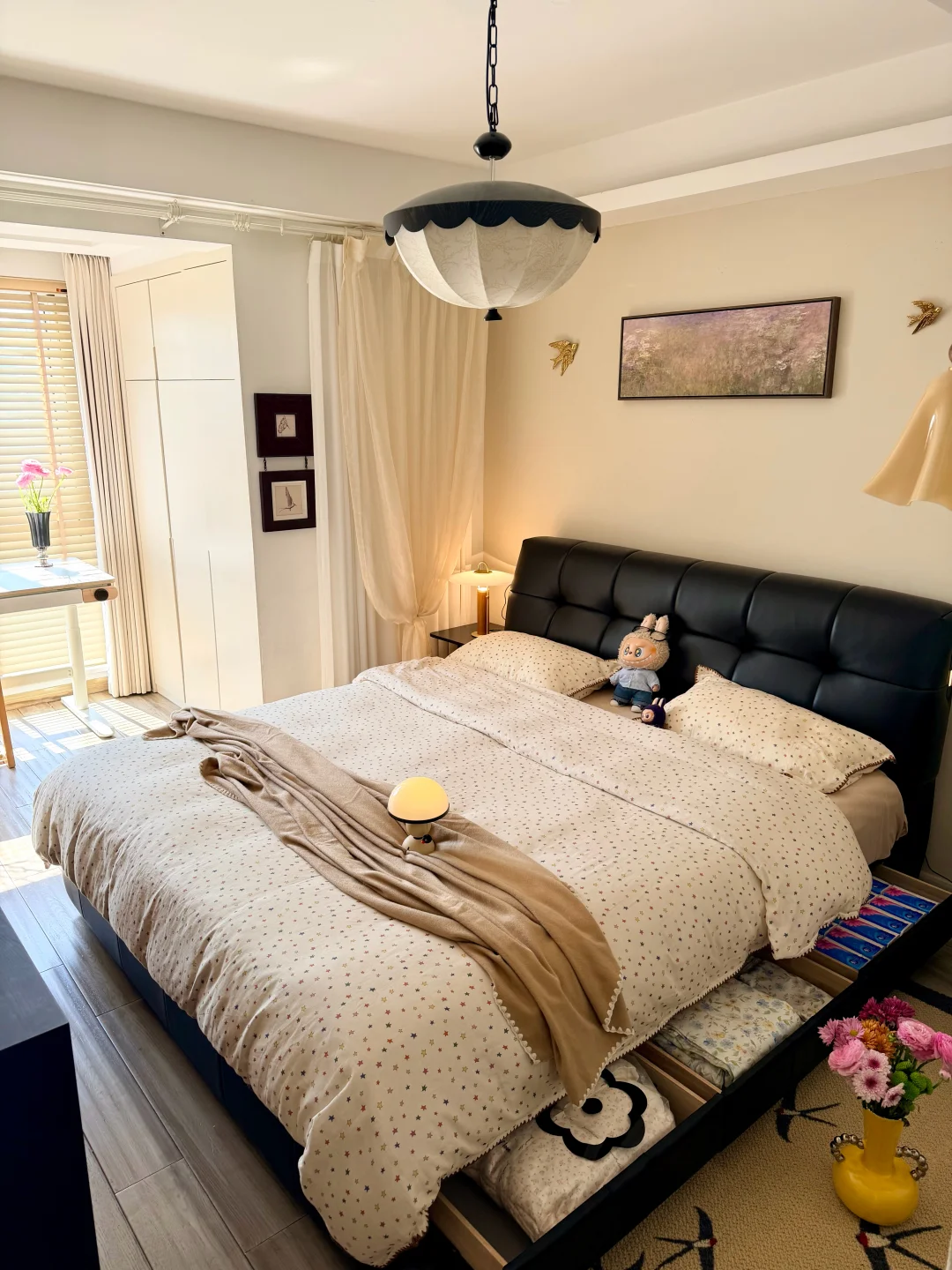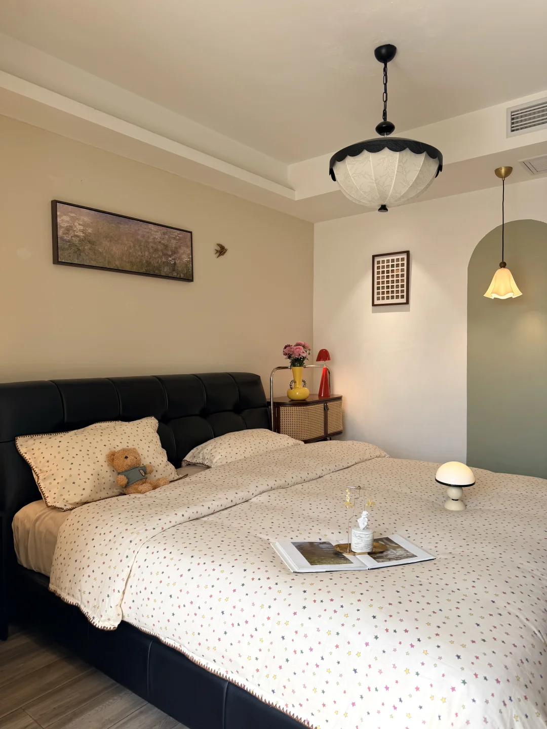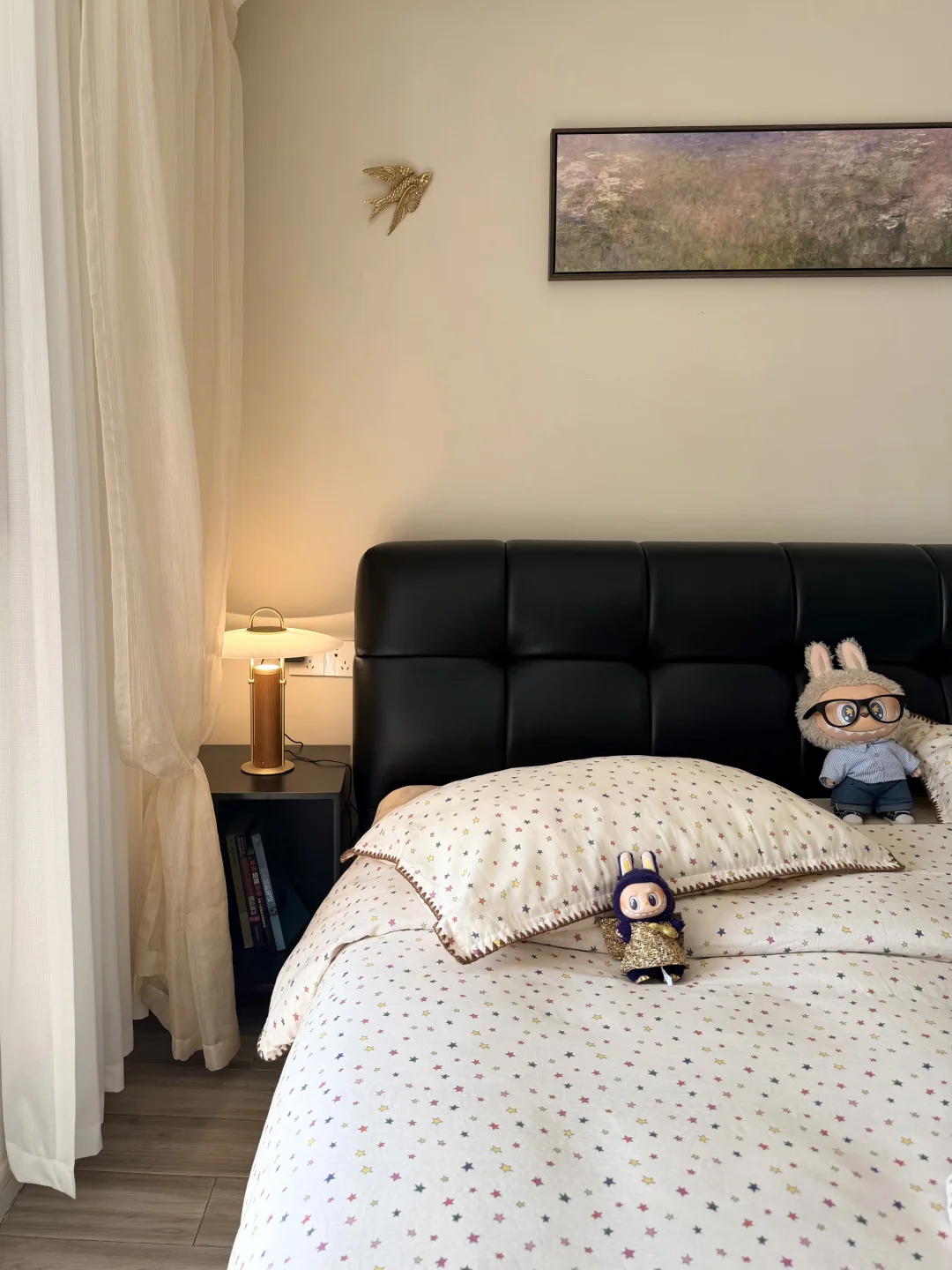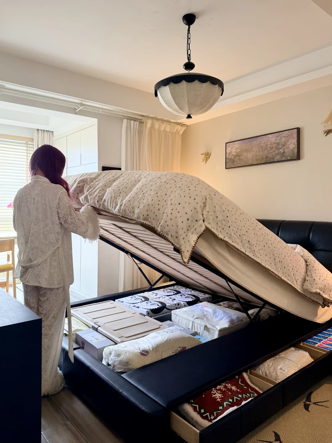 改造这套精装房的时候 我真的没少动脑子 12㎡的小卧室 既想要温柔好看 又想要“真的能装” - 现在回头看 它已经慢慢变成我最放松的一间房了👇 🍮卧室总面积15㎡(含3㎡独卫) 开间3.3m 梳妆台宽40cm 过道预留60cm 小,但每一寸都得算数 - 🍮关于硬装 先把空间“稳住” 房间小,没做复杂造型 四周一圈石膏线+回型吊顶 把层高拉出来,人一进来就不压 - 原本冷冰冰的天蓝色墙面 全部换成奶咖色 一下就柔软了很多 - 侧面刷了一面复古绿拱门 中古氛围瞬间有了 阳台打通,做成嵌入式衣柜+书桌区 黑白棕配色一上 小房间也开始有“情绪”了~ - 🍮关于软装:收纳,才是关键一击 一开始完全是按喜好买家具 直到有了孩子,衣柜直接爆仓 杂物开始见缝插针 才发现:好看没用,装不下才最折磨人 - 做了很久功课 最后换了佐尔适中古泡芙储物床 床头是加厚头层小黄牛皮 饱满得像一张大沙发 晚上靠着刷手机、看书 后背被稳稳托住 一天的疲惫真的会慢慢散掉 - 齐边设计特别重要 床体和墙面贴合得很干净 过道终于不再被“偷走”空间 小卧室也能走得顺、站得开 - 床底是整箱框结构 空间非常完整 换季被褥、行李箱、闲置杂物 统统“消失”进去 对小户型来说 这真的就是一整个隐藏衣柜 - 床侧还有3个加高抽屉 内衣、袜子、纸巾、常用床品 随手分类,再也不用翻来翻去 气压杆一抬就起 单手操作也很轻松 收纳这件事,终于不再是负担 - ✨一些让我觉得“被照顾到”的细节 • 床头自带 USB 充电口 • 感应小夜灯,起夜不刺眼 • 加密排骨架,稳得很 小朋友在床上蹦,我也不会提心吊胆 - 房间不大 但住得舒服、用得顺 每天回到这里 都是一种被生活接住的感觉