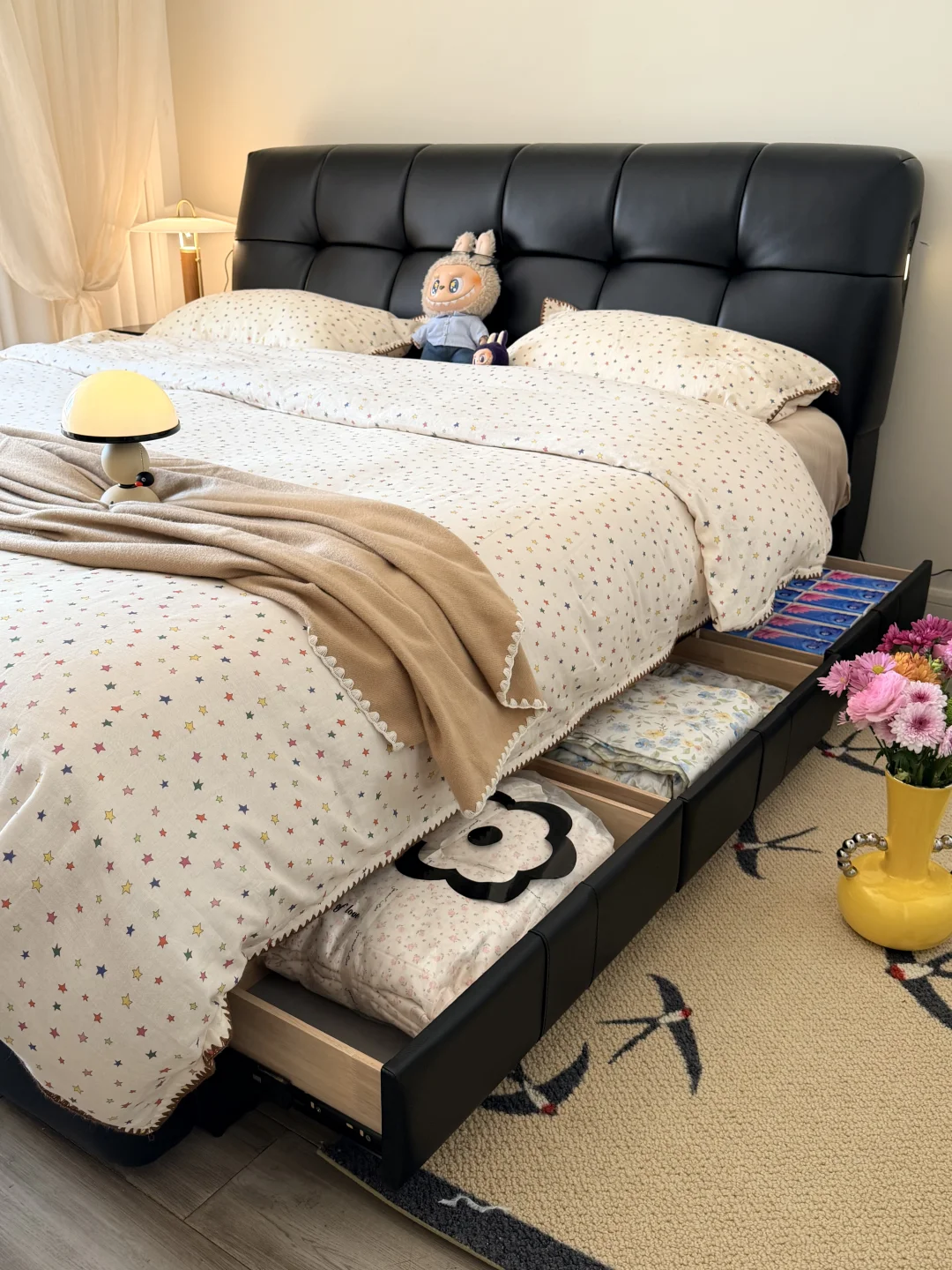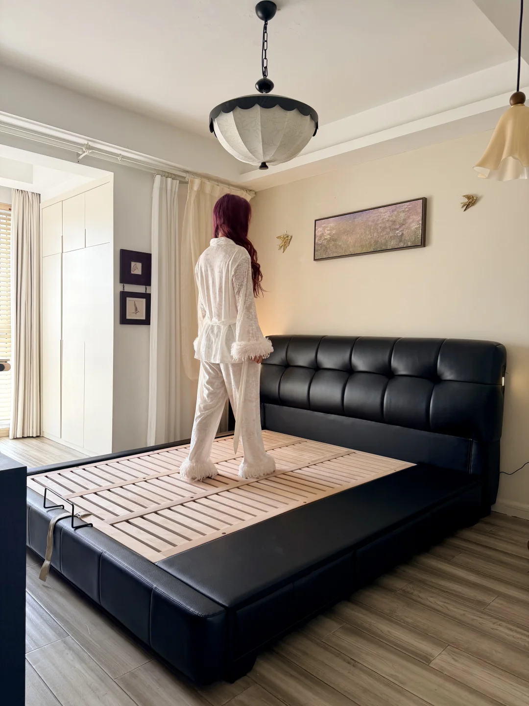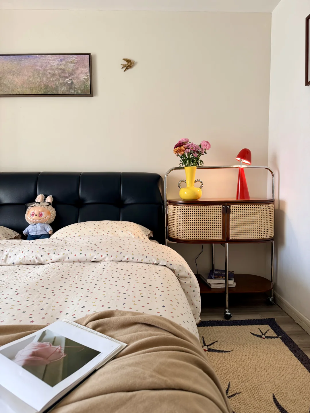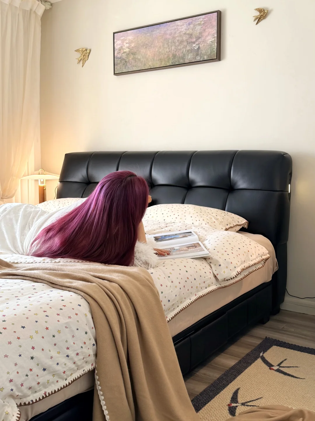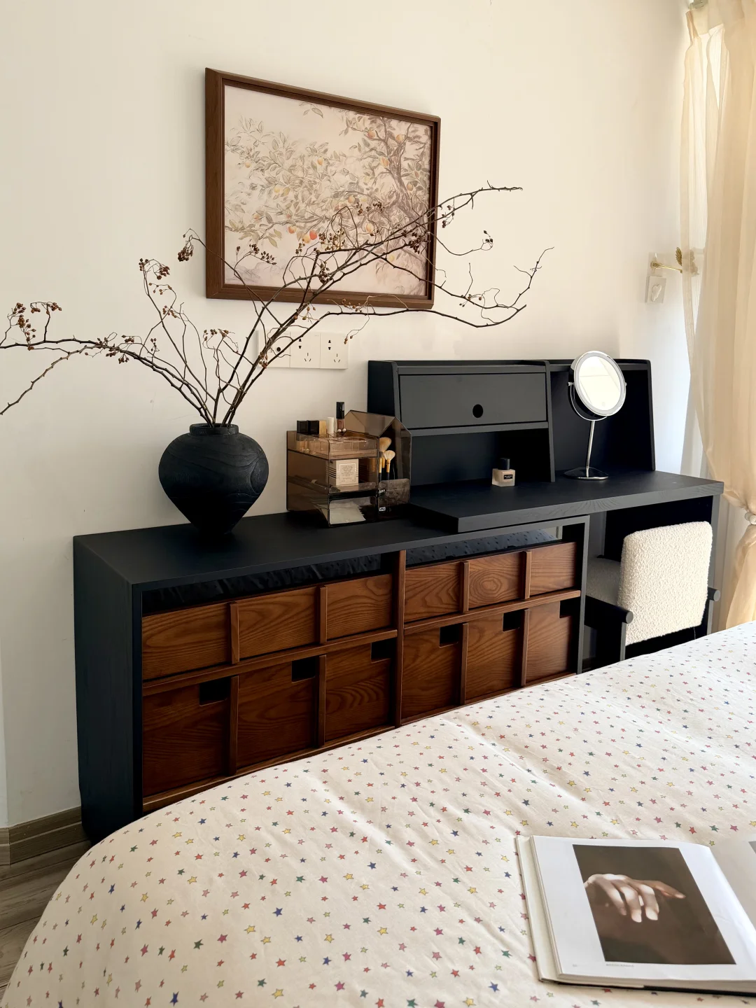 改造这套精装房的时候 我真的没少动脑子 12㎡的小卧室 既想要温柔好看 又想要“真的能装” - 现在回头看 它已经慢慢变成我最放松的一间房了👇 🍮卧室总面积15㎡(含3㎡独卫) 开间3.3m 梳妆台宽40cm 过道预留60cm 小,但每一寸都得算数 - 🍮关于硬装 先把空间“稳住” 房间小,没做复杂造型 四周一圈石膏线+回型吊顶 把层高拉出来,人一进来就不压 - 原本冷冰冰的天蓝色墙面 全部换成奶咖色 一下就柔软了很多 - 侧面刷了一面复古绿拱门 中古氛围瞬间有了 阳台打通,做成嵌入式衣柜+书桌区 黑白棕配色一上 小房间也开始有“情绪”了~ - 🍮关于软装:收纳,才是关键一击 一开始完全是按喜好买家具 直到有了孩子,衣柜直接爆仓 杂物开始见缝插针 才发现:好看没用,装不下才最折磨人 - 做了很久功课 最后换了佐尔适中古泡芙储物床 床头是加厚头层小黄牛皮 饱满得像一张大沙发 晚上靠着刷手机、看书 后背被稳稳托住 一天的疲惫真的会慢慢散掉 - 齐边设计特别重要 床体和墙面贴合得很干净 过道终于不再被“偷走”空间 小卧室也能走得顺、站得开 - 床底是整箱框结构 空间非常完整 换季被褥、行李箱、闲置杂物 统统“消失”进去 对小户型来说 这真的就是一整个隐藏衣柜 - 床侧还有3个加高抽屉 内衣、袜子、纸巾、常用床品 随手分类,再也不用翻来翻去 气压杆一抬就起 单手操作也很轻松 收纳这件事,终于不再是负担 - ✨一些让我觉得“被照顾到”的细节 • 床头自带 USB 充电口 • 感应小夜灯,起夜不刺眼 • 加密排骨架,稳得很 小朋友在床上蹦,我也不会提心吊胆 - 房间不大 但住得舒服、用得顺 每天回到这里 都是一种被生活接住的感觉