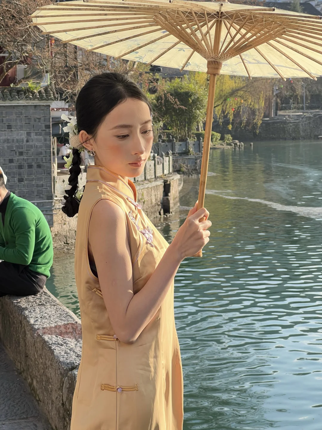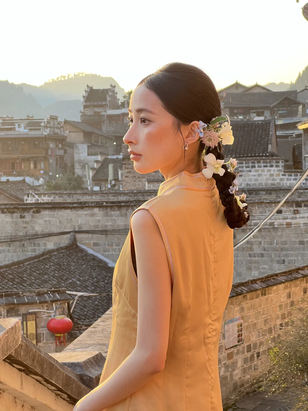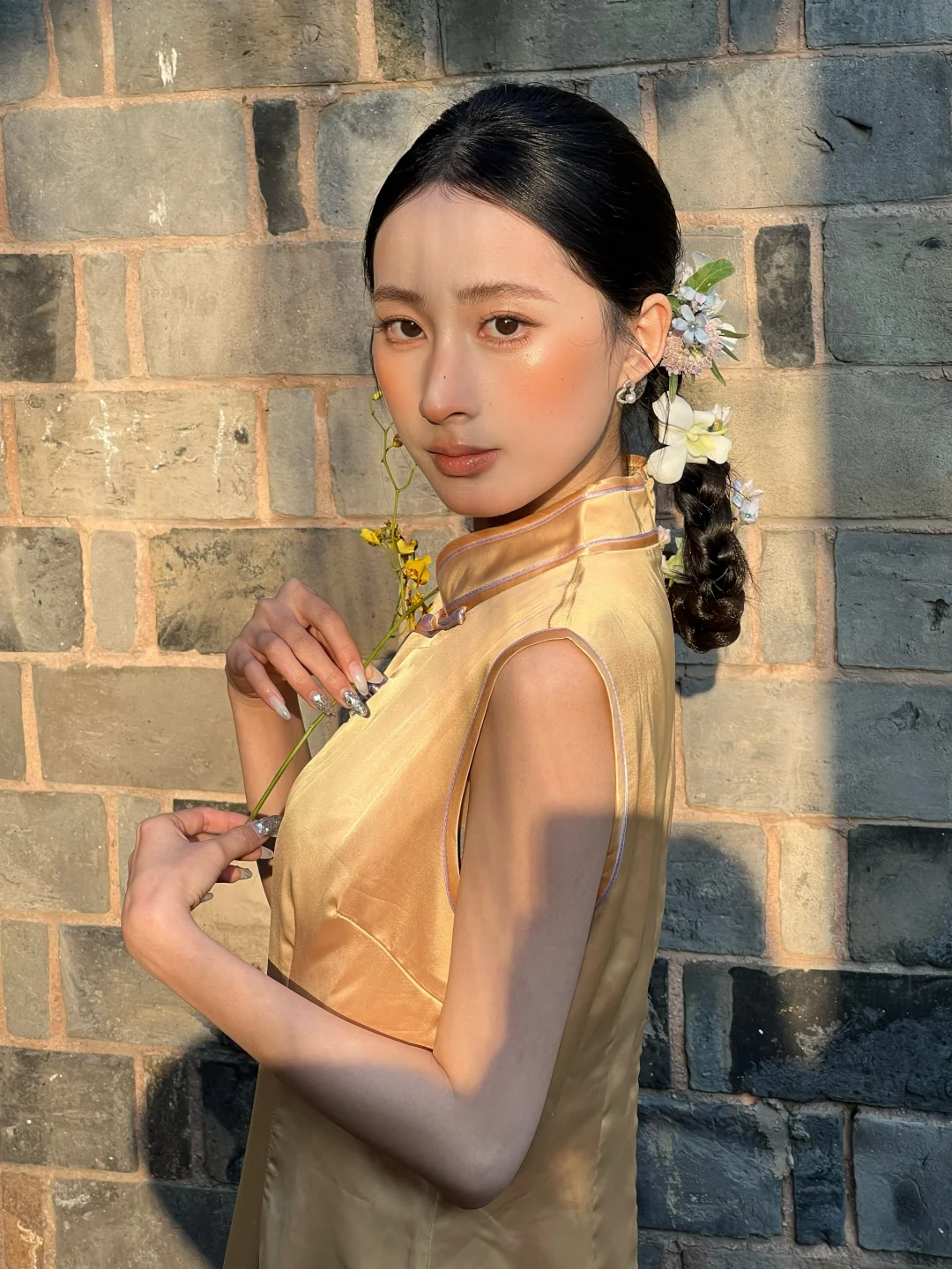 风拂柳,粉樱绽放,我身着浅粉蕾丝旗袍,立于古栏之下。长袖轻笼,盘髻缀珠,耳坠摇曳