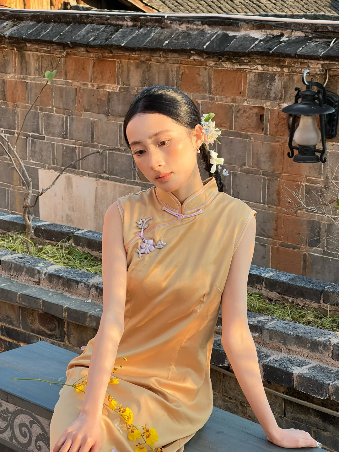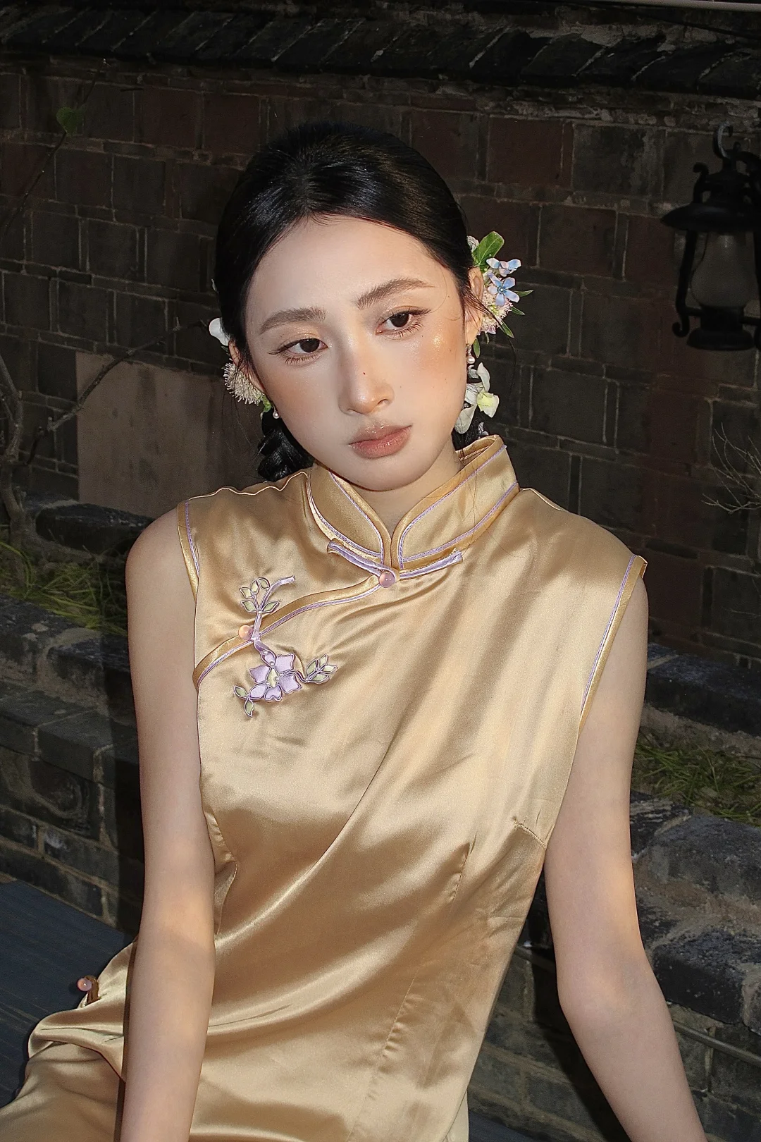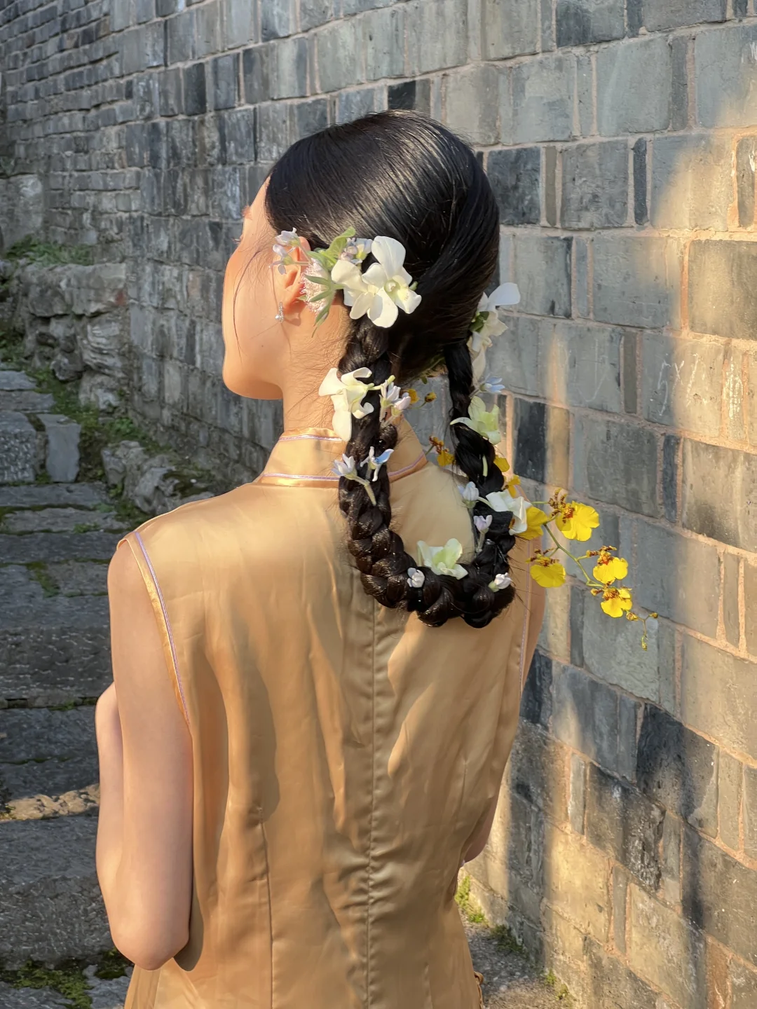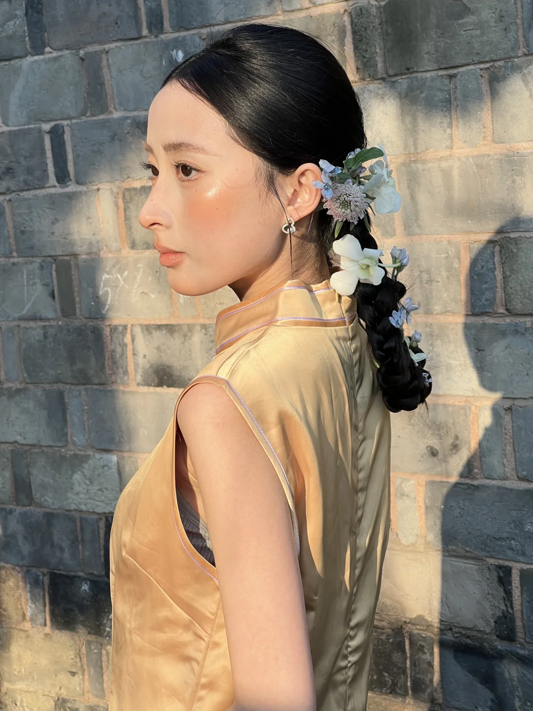 风拂柳,粉樱绽放,我身着浅粉蕾丝旗袍,立于古栏之下。长袖轻笼,盘髻缀珠,耳坠摇曳