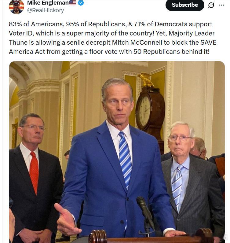 83%的美国人、95%的共和党人和71%的民左党人支持选民身份证法案,这在全美范围内已属于压倒性多数!然而,共和党多数党领袖图恩却允许年迈体衰的米奇·麦康奈尔阻挠《拯救美国法案》获得全院投票支持——而实际上已有50名共和党议员支持这项法案!