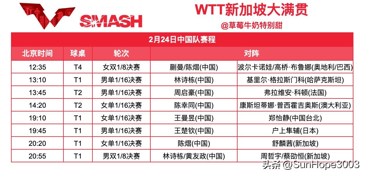 2月24日,新加坡大满贯王楚钦,林诗栋,王曼昱等出场比赛。 双打1/8决赛,单打1/16决赛,将在24号开始。 今天进行的是1/32决赛, 中国队的温瑞博和覃予萱被淘汰,其他球员全部晋级, 但是这一轮比赛还没有结束,莎莎她们的比赛在23号进行。 24号王楚钦的比赛仍然是在晚上,对战的是户上隼辅,这一场比赛很难打,要做好困难准备。 林诗栋,陈熠都是一天两赛了。 中国队加油!