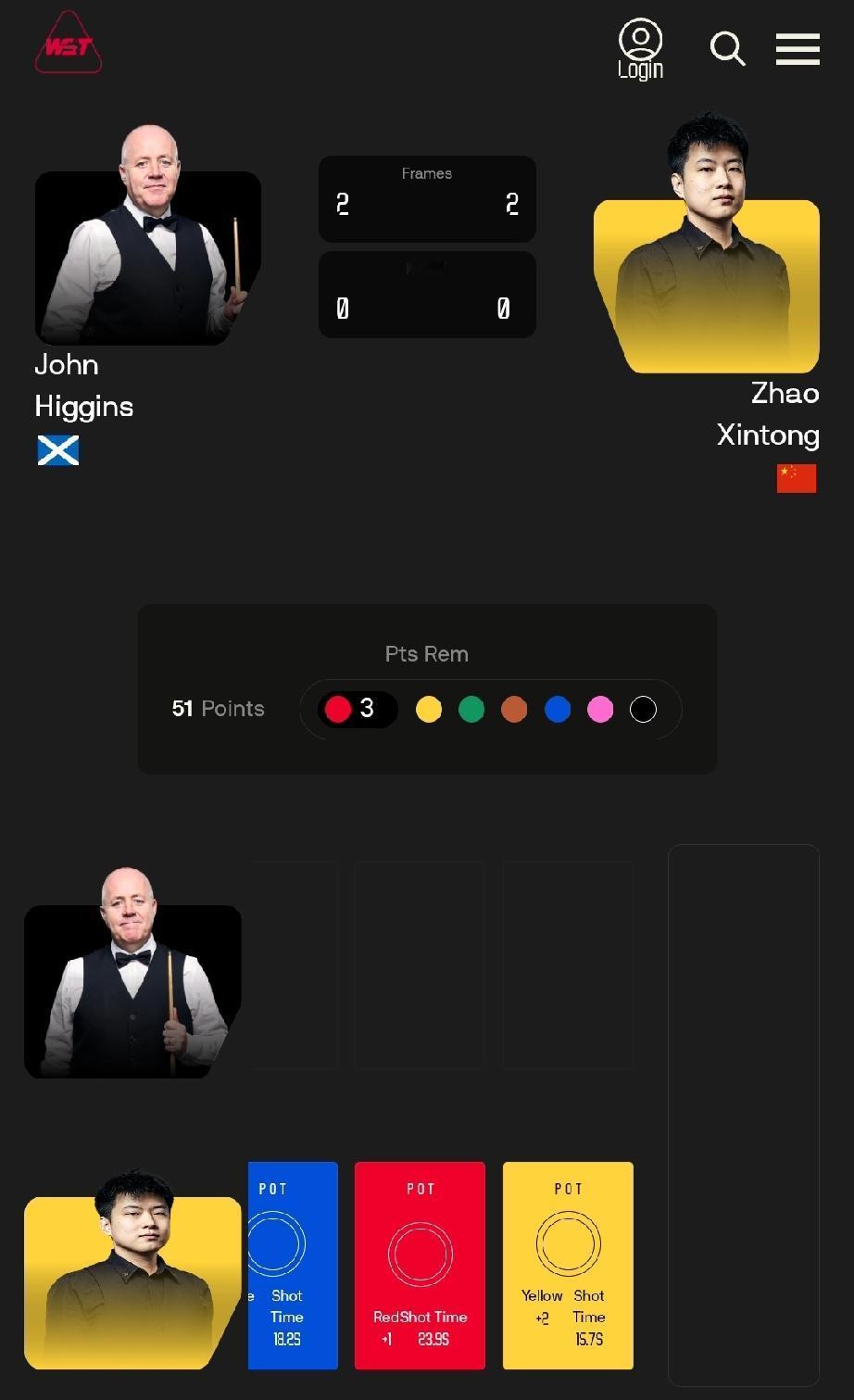球员锦标赛决赛第一阶段 赵心童 2-2 约翰·希金斯 2月22日21点,2026斯诺克球员锦标赛决赛第一阶段比赛开杆。赵心童对阵希金斯。半决赛两人以6-5相同的比分淘汰了马克·艾伦和贾德·特鲁姆普,惊险会师决赛。 第一阶段进行8比赛,明晨3点开始第二阶段比赛,抢十获胜。 第一阶段前两局,约翰希金斯运气不错,连赢两局,2-0领先赵心童!第三局,赵心童打出单杆62分获胜,比分来到1-2,接着轻松拿下第四局,比分2-2战平。