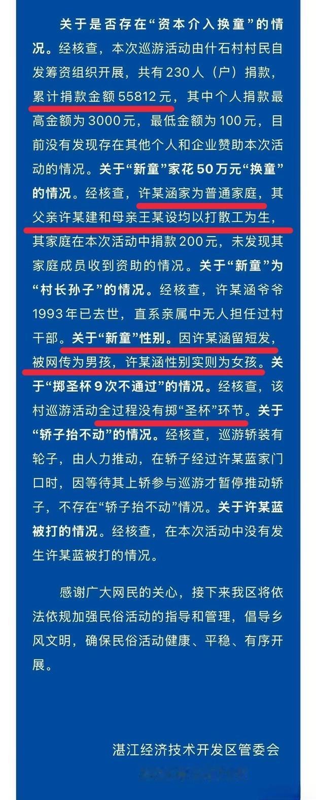 官方通报来了,完美印证我的上一条。现在的当务之急,是抓捕造谣传谣的违法人员。 两个妈祖儿童都是女童,没有男童。都是一个村的,都姓许。一个十岁,一个十七岁。新童父母出资了两百块钱,这活动总共募资五万多。 全程根本不存在“掷圣杯”和“八个壮汉抬不动轿子”的玄虚情节。