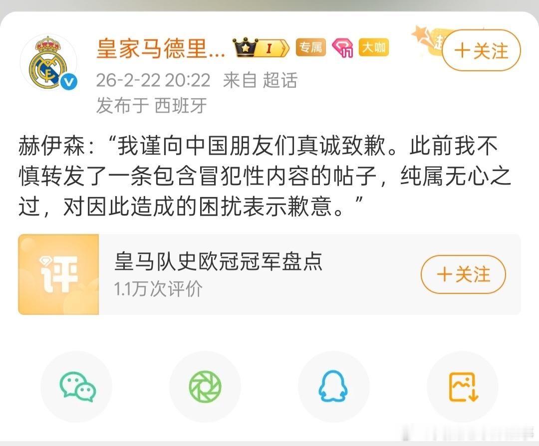 赫伊森通过皇马官博道歉了,说自己不慎转发👀