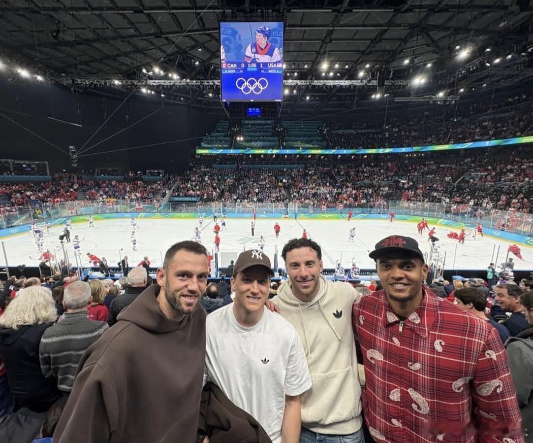 国际米兰球员徳弗赖、阿坎吉、奥古斯托和泽林斯基观看冬奥会冰球比赛国际米兰冬奥会谷爱凌金牌