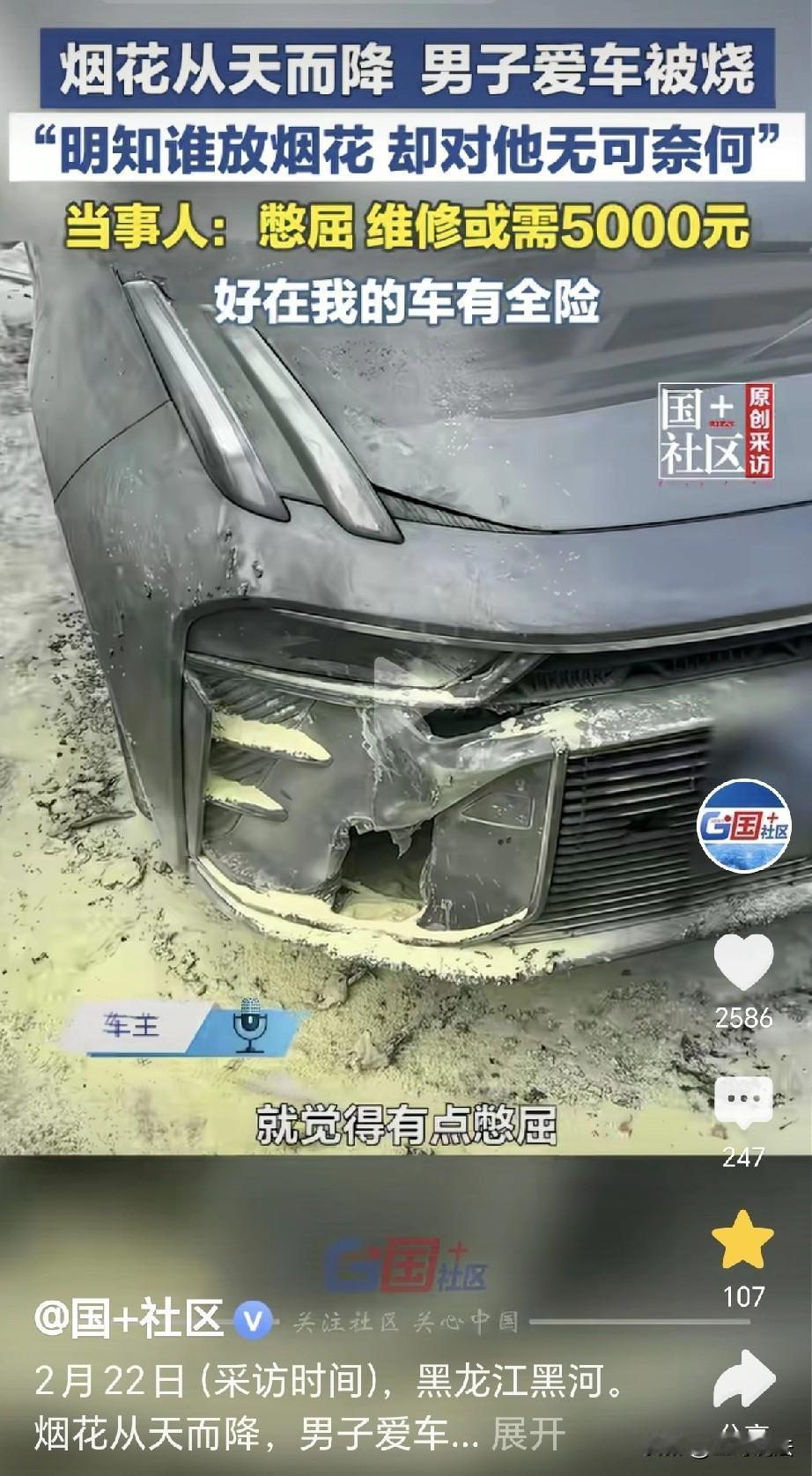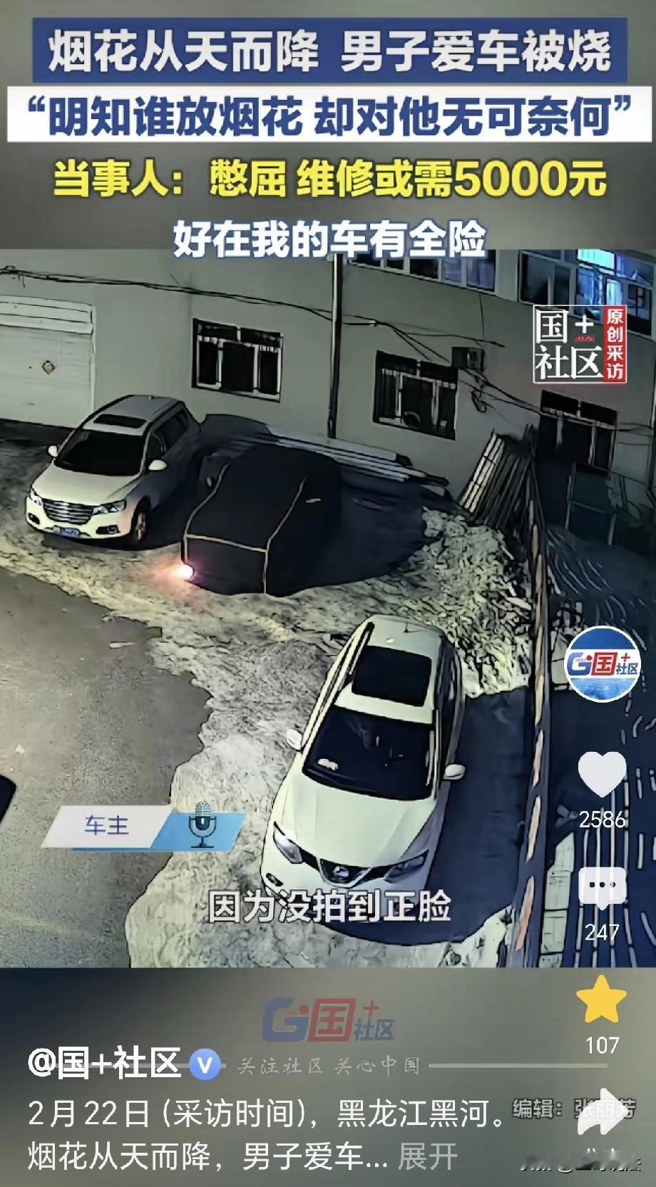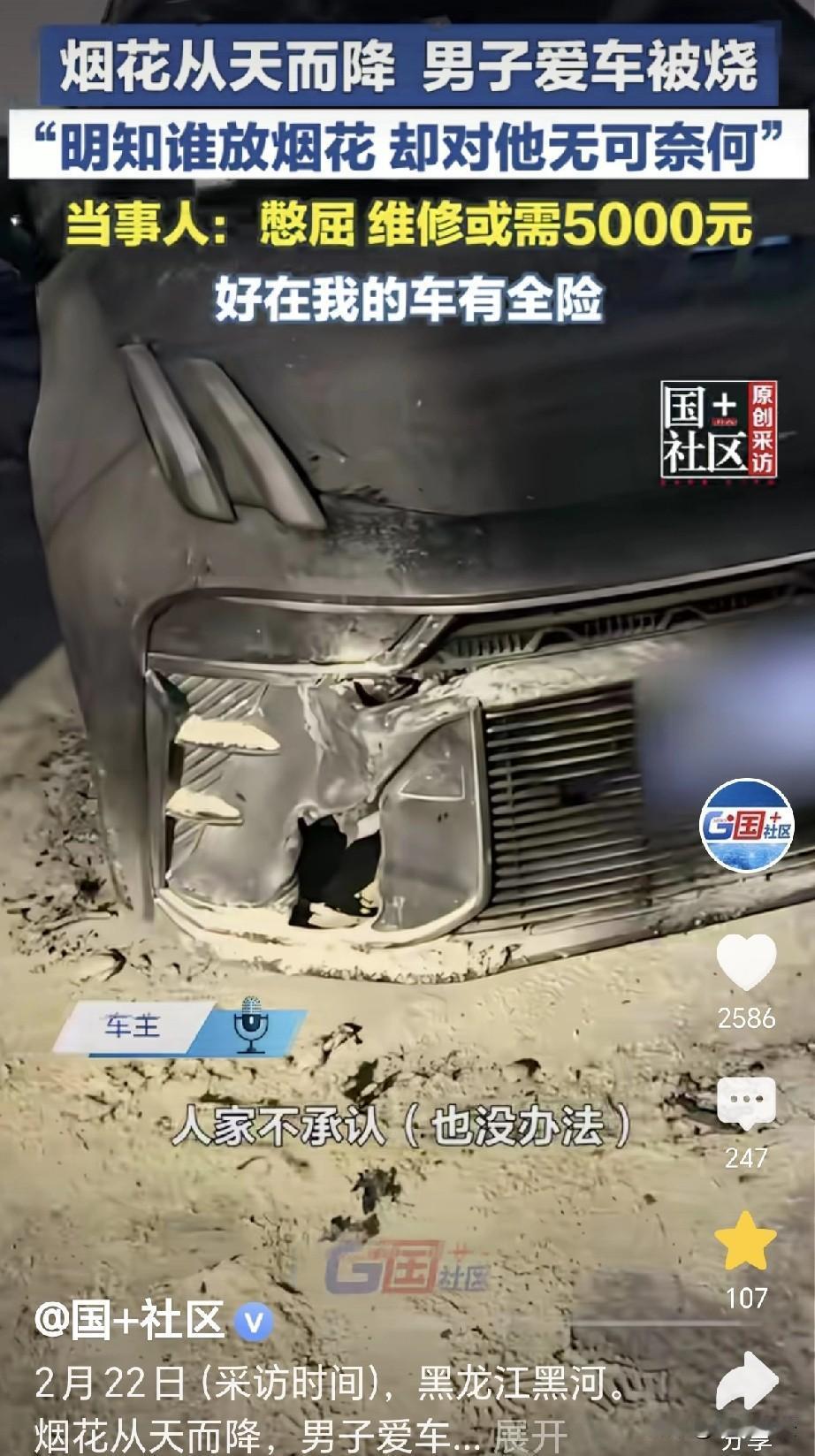 黑龙江黑河,一男子车停在楼下,盖了车衣,一束烟花从天而降,落在他车灯处继续燃烧,车衣着了,车被烧坏,男子调出监控,拍到扔烟花人,但没拍到正脸,那人死不承认,男子憋屈: 维修费要5000元左右,明知道是谁,人家不承认也没办法,好在我的车有全险。 一男子回到家里,把车稳稳的停在了楼下,因为下雪,雪积到了路边,他为了防尘,还在车上蒙了一个车罩。 他回到家里,安心在家里休息,因为楼下都装有摄像监控。 谁知到了晚上,夜深人静之时,院子里无人经过,可万万没有想到,一束烟花从天而降。 那烟花落下来时,本来没有落在车上,而是落在了地上,又弹了起来,弹在了男子车辆右侧的大灯下面。 烟花呲着火花,瞬间烧到了车罩,车罩瞬间点燃,连带着车里面也烧了起来。 等到男子发现了动静,立刻出来查看,右灯处已被烧坏,烂了大洞,从外面一看,被烧的十分严重。 他调出监控,监控上显示,烟花是从楼上掉落,可楼上有好多层,监控只拍到扔烟花人,却没拍到那人的正脸。 男子气急,他已经看到是哪一个人,他知道是谁,就住楼上,抬头不见低头见,最起码也是个脸熟。 男子捡起那个已经燃烧过的烟花,找到那个人对质,那人家里正好就有这种烟花。 可是,人家就不承认,你说是我,你要拿出来证据才行! 我家有烟花,你也不能说是我扔的,买烟花的人多了,你凭什么说是我扔的? 男子无言,他就知道是对方扔的,可那个监控他看了几遍,就是没拍到正脸,现在他没有证据,人家就说不是自己扔的。 男子无言,把被烧视频发布了出来,男子感叹,我好憋屈,家里烟花都查到了,明知道是谁扔的,人家就是死不认账! 如今车辆被烧毁,维修需要5000元左右,万幸的是,男子的车有全险,不然他就损失大了。 有人认为,这很简单,可以直接起诉全楼,让楼上的人自证没有买鞭炮,不能自证的均摊。这是法律规定的高空抛物找不到责任人是的办法,这里也可以用。 也有人说,过年最好别罩车罩子,不套车衣都不会被烧。 有人说他过年,就怕有人扔鞭炮,他就把把车位一锁,停地下车库去了,说花点钱买清静,免得出这样的事情扯皮生气。 那么,监控没有拍到正脸真的就没有办法了吗? 《民法典》第1254条规定: 高空抛物责任规则:从建筑物抛掷物品致他人损害的,由侵权人承担责任。 若无法确定具体侵权人,可将可能加害的建筑物使用人列为被告,若使用者不能证明自己非侵权人,需承担补偿责任。 这个男子找到楼上住户对质,但对方不承认,确实可以采取这个办法维权。 也就是说,男子不需要拍到正脸也能维权。 虽然监控没拍到扔烟花的人,但只要能确定烟花是从楼上扔下来的,男子就可以把这栋楼的所有住户列为被告。 如果住户不能证明自己没扔烟花,就要一起分担赔偿。 并且,既然男子已经找到扔烟花的人,而且对方家里有同款烟花,就可以直接起诉他。 法院会根据监控里的人影、烟花型号匹配这些证据,大概率会判对方赔钱。 另外,如果扔烟花的是小孩,家长就要承担赔偿责任,就算小孩不承认也没用。 如果小区是禁放区域,扔烟花的人还可能被治安拘留。 总结如下: 监控不用纠结正脸只要能锁定大概楼层和时间,结合同款烟花物证,法院就会支持索赔。 如果对方死不认账,可以直接起诉全楼住户,一般会有住户主动站出来指证,倒逼扔烟花的人认错。 保险理赔不代表结束,保险公司赔钱后,会向扔烟花的人追偿,不用自己麻烦折腾。 这几个办法,你记住了吗?