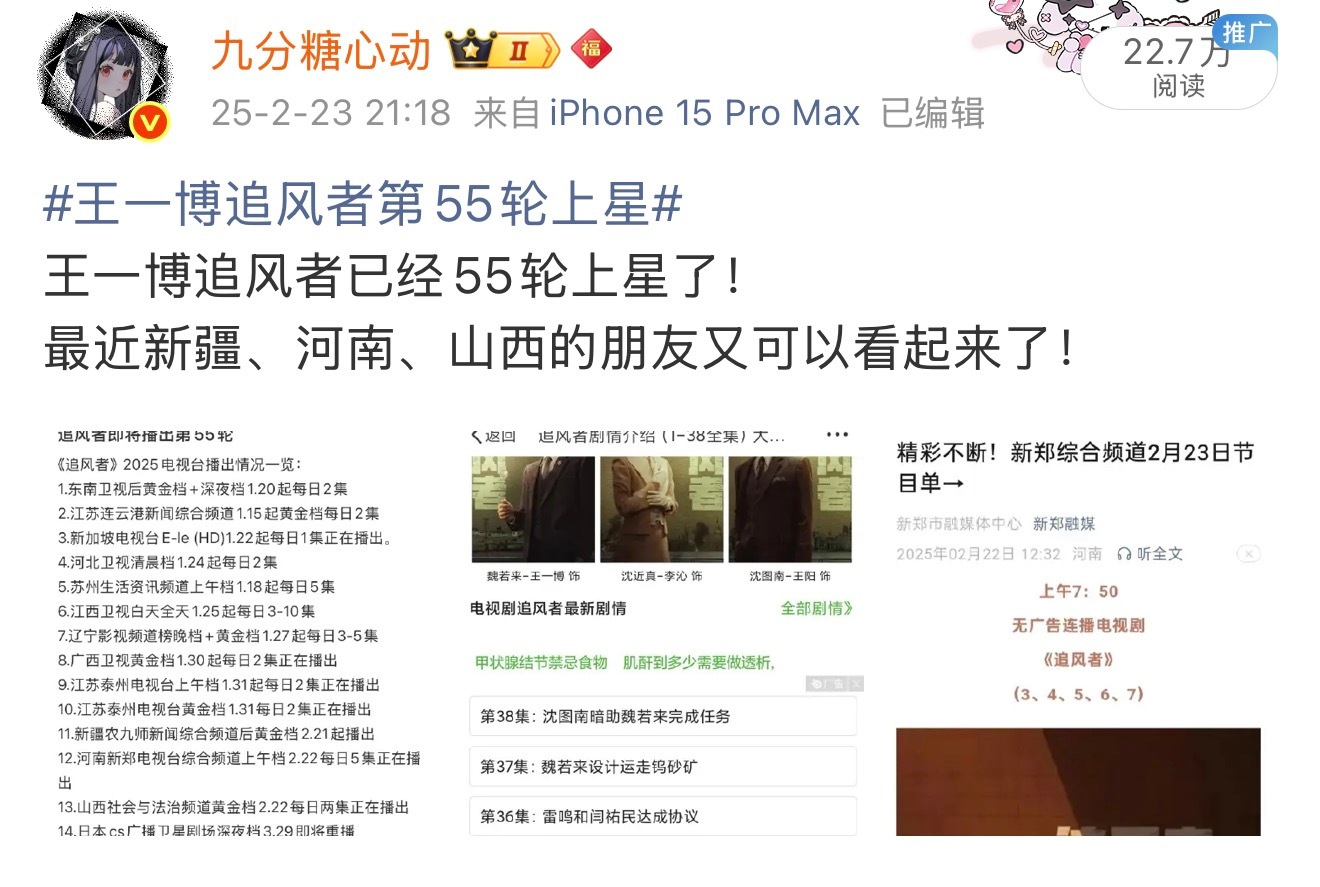 王一博 去年今日,追风者还在第55轮上星轮播。截至到今年今天,追风者居然已经167轮上星轮播了,这可是24年3月首播的剧!