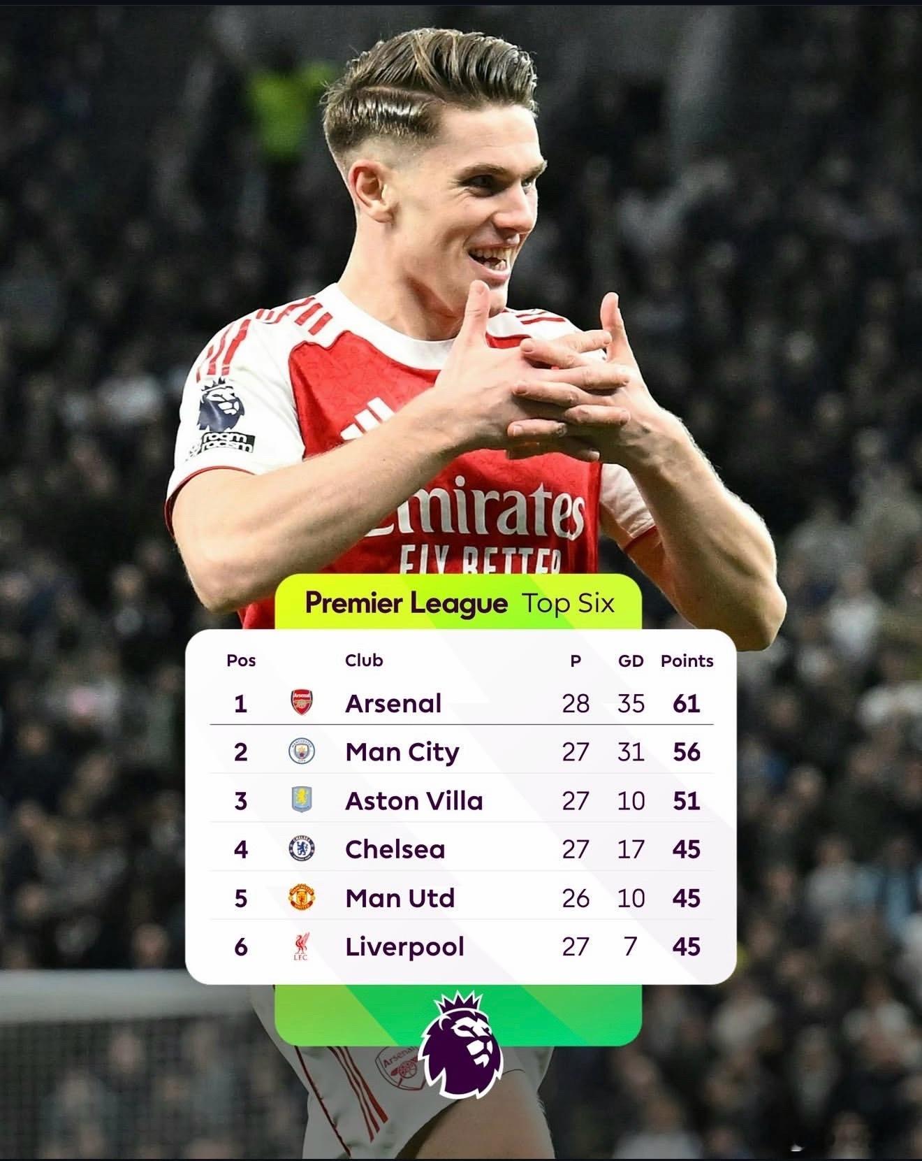 热刺vs阿森纳全场比赛结束!4 比 1!阿森纳以 61 分,在多赛一场的情况下,继续保持着对曼城的 5 分领先。埃泽本赛季英超到现在一共进了 6 个球,其中 5 个是面对热刺打进的。这场胜利,也是阿森纳英超联赛最近 5 次北伦敦德比对热刺的 5 连胜。下一轮,曼城客场挑战利兹联,阿森纳主场迎战切尔西。